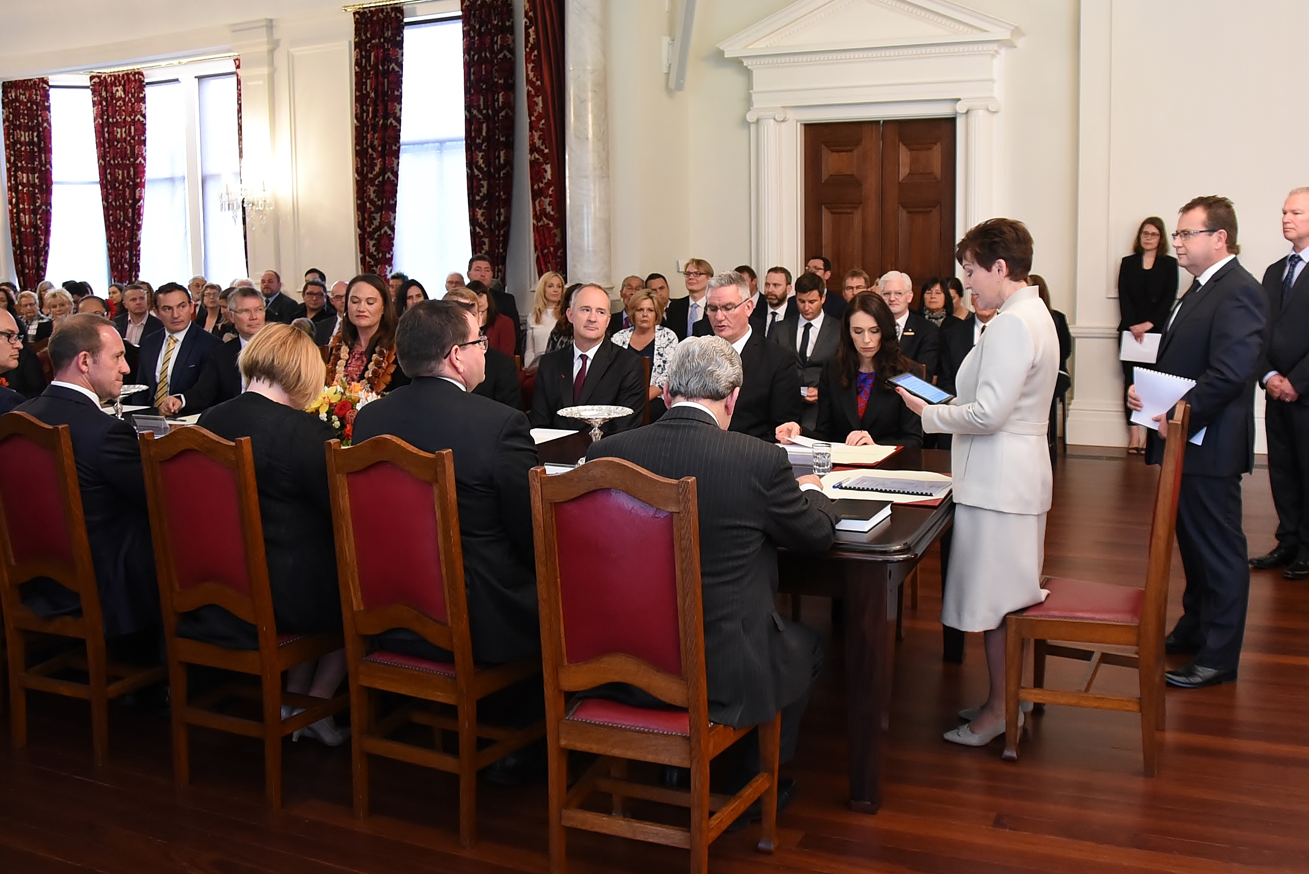 총독 임명장은 취임 전에 수석 대법관과 뉴질랜드 행정평의회 위원들이 참석한 가운데 공개적으로 낭독된다. 그 후 수석 대법관 또는 다른 고등법원 판사가 총독에게 충성 서약(또는 선서)과 직무 서약(또는 선서)을 시행한다.[17][8]