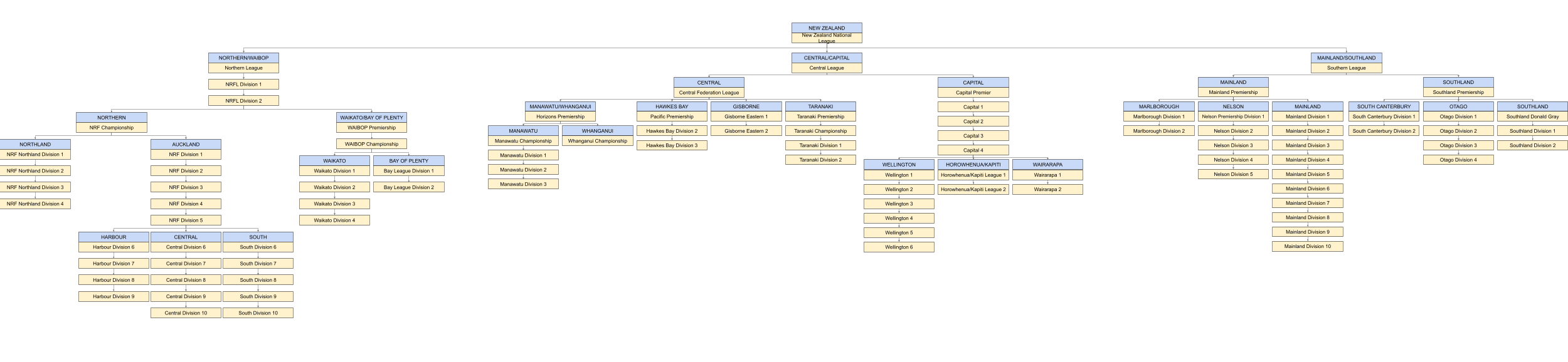 4 | NRFL 북부 콘퍼런스 (9개 클럽) NRFL 남부 콘퍼런스 (8개 클럽) | 호라이즌 프리미어십 (8개 클럽) 퍼시픽 프리미어십 (7개 클럽) 기즈번 이스턴 1 (8개 클럽) 타라나키 프리미어십 (6개 클럽) | 캐피털 1 (10개 클럽) |
