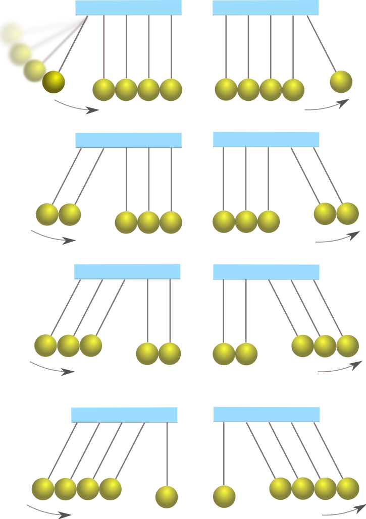 이 시퀀스의 바로 뒤에서, 두 번째 움직이는 공은 방금 멈춘 첫 번째 움직이는 공으로 운동량을 전달하고, 그 시퀀스는 첫 번째 시퀀스의 바로 뒤에서 즉시 그리고 감지할 수 없게 반복되어, 처음 두 개의 충돌하는 공 사이에 있었던 것과 동일한 작은 간격으로 다섯 번째 공 바로 뒤에서 네 번째 공을 배출한다. 만약 그들이 세 번째 공을 칠 때 단순히 접촉하고 있다면, 정밀도 유지를 위해 더 완전한 해가 필요하다.