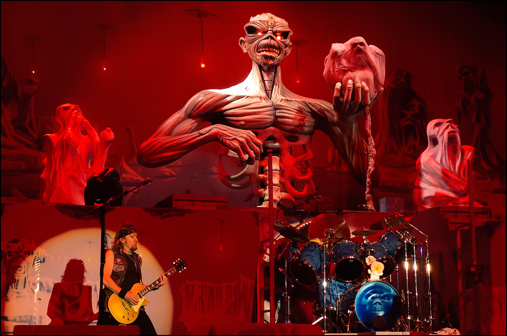 NWOBHM의 대부분의 밴드는 팬들과 같은 모습을 하고 있었으며 특별한 시각 효과 없이 록 쇼를 공연했다. 주목할 만한 예외는 아이언 메이든으로, 그들은 데뷔 초부터 공연을 풍성하게 만들기 위해 끔찍한 캐릭터 에디 더 헤드를 무대 소품으로 만들었다.[26] 다른 예외로는 공연에서 다양한 소품, 의상, 트릭을 사용한 데몬, 클로븐 후프 및 샘슨이 있으며, 페이건 알타와 베놈은 쇼크 록과 사탄 숭배에서 영감을 얻은 정교한 무대 연출로 유명해졌다.[27]