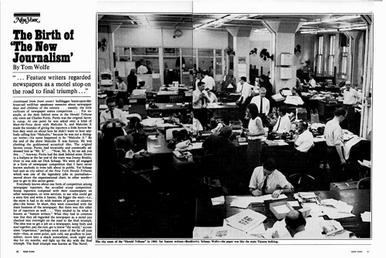 울프는 1962년 게이 탤리스가 조 루이스에 대해 쓴 ''에스콰이어'' 기사에서 새로운 스타일의 보도를 처음 접했다고 썼다. #REDIRECT 조 루이스 50세'는 마치 단편 소설처럼 시작되었고, 탤리스가 처음으로 소설 기법을 보도에 적용했다고 언급했다.[20] ''에스콰이어'' 편집장 해럴드 헤이스는 "60년대에는 사건들이 너무 빨리 진행되어 예술의 삼투 작용이 그에 따라갈 수 없었고, 우리는 좋은 소설가를 찾으면 즉시 그를 현재 사건의 달콤한 미스터리로 유혹하려고 했습니다."라고 회고하며, ''에스콰이어''가 이러한 새로운 기법의 발상지로서 공을 세웠다고 주장했다.[21] 곧 다른 매체들, 특히 ''뉴욕''이 ''에스콰이어''의 선례를 따랐고, 이 스타일은 결국 다른 잡지와 책에까지 이르렀다.[22]