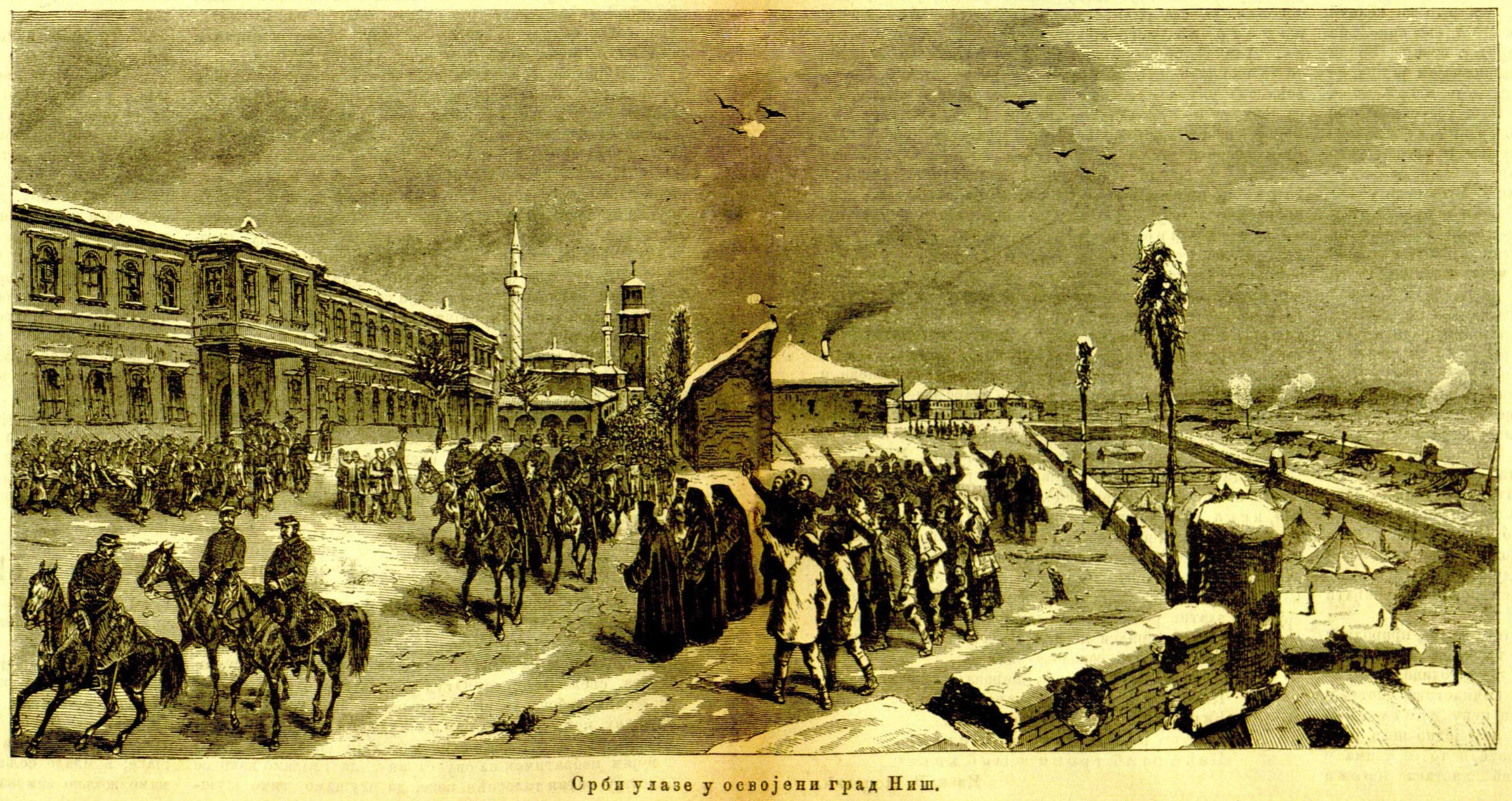 1876~1878년 세르비아-오스만 전쟁에서 세르비아군에 의해 니슈가 함락되었다. 니슈 해방 전투는 1877년 12월 29일에 시작되었고, 세르비아군은 1878년 1월 11일에 니슈에 진입하여 니슈는 세르비아의 일부가 되었다. 알바니아인 거주 지역이 불타고, 대부분 알바니아인이었던 도시의 무슬림 인구 중 일부는 오스만 코소보 빌라예트로 강제 이주당했으며,[41][42][43][46] 프리슈티나에 정착한 사람들도 있었고, 스코페로 간 사람들도 있었다.[41][42][43][46] 현재 코소보의 일부 지역에 정착한 알바니아인들의 후손들은 무하지르로 알려져 있다.[44] 전쟁 전 약 8,500명이었던 무슬림 인구는 로마인 무슬림을 포함하여 1,168명으로 줄었다.[45][46] 니슈의 알바니아인 시장은 파괴되었고, 15개 모스크 중 12개와 4,000채의 주택 중 약 1,300채가 철거되었다. 나머지 무슬림 주택은 할인된 가격으로 매각되었다. 무슬림, 유대인, 그리고 반항적인 기독교인들이 소유한 건물의 파괴는 거리 확장 및 기타 도시 "현대화" 조치를 통해 오스만 제국의 영향력을 약화시키는 것으로 이어졌다. 남고자 했던 알바니아인 상인들은 표적 살인의 대상이 되었다.