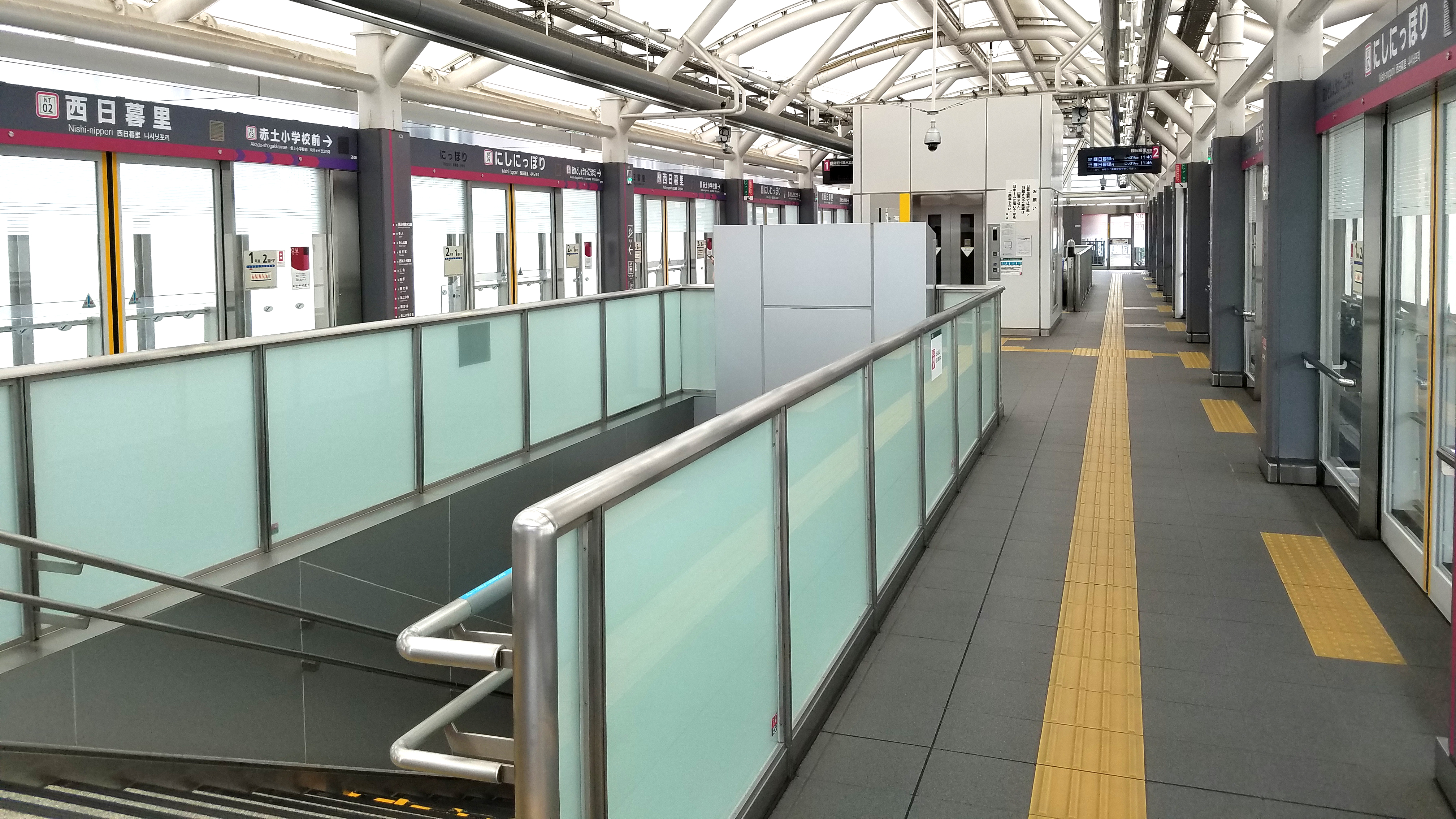 2008년3월 30일 개업 당시에는 무인역으로 닛포리역에서 원격 관리되었지만,[31] 현재는 도쿄도 영업 교통 협력회가 수탁하는 업무 위탁역이 되었다.