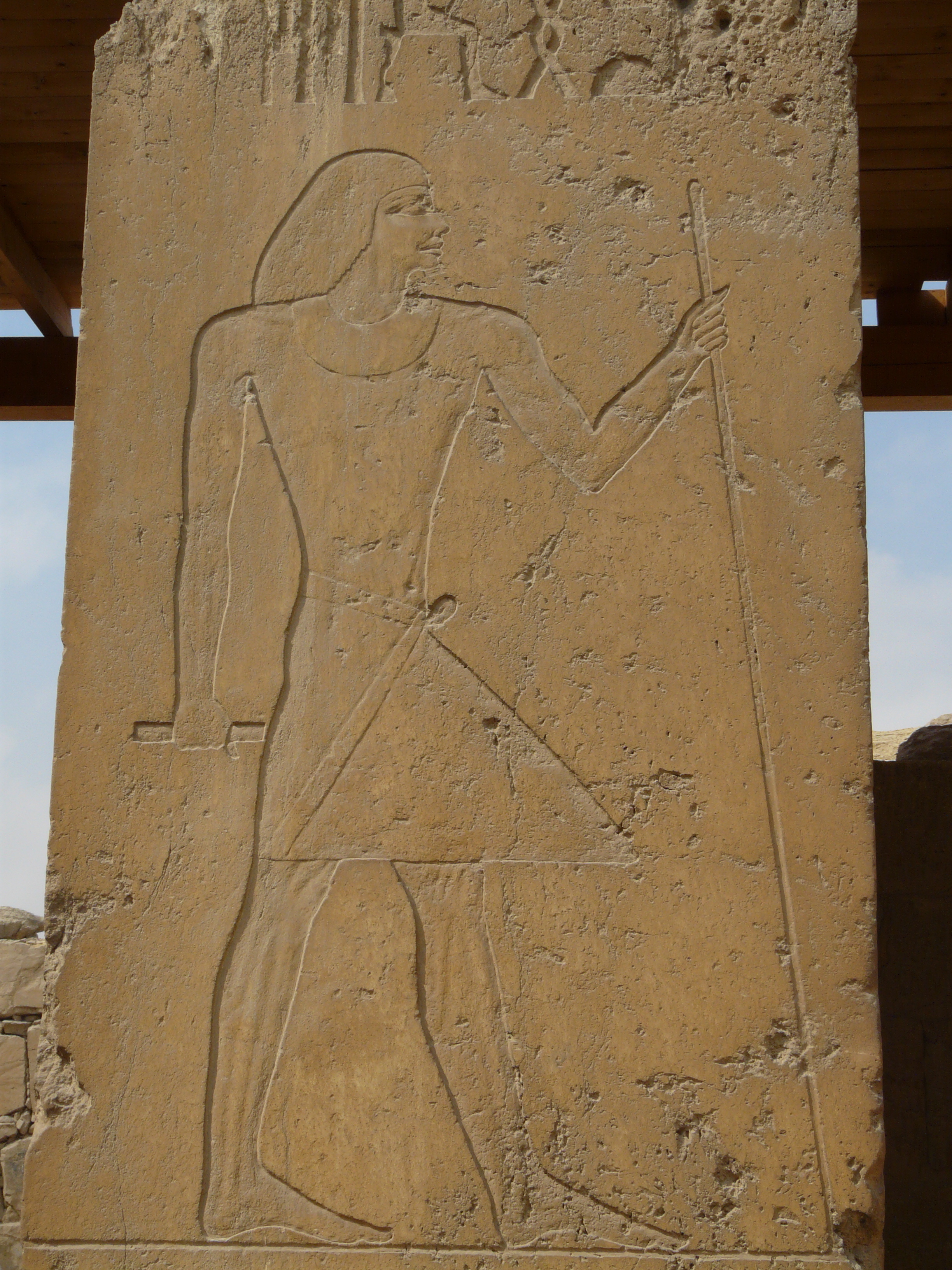 이 신전은 나일 강에 더 가까이 위치한 계곡 신전에서 출발하는 긴 참도를 따라 동쪽에서 들어갔다. 상부 신전은 동쪽에 있는 다섯 개의 화강암 출입구를 통해 들어갈 수 있는 커다란 직사각형 안뜰로 구성되었다. 제단은 안뜰 중앙에 위치해 있으며, 오늘날에도 볼 수 있다. 설화석고로 만들어진 다섯 개의 큰 블록으로 구성되었으며, 하나는 라의 상형 문자 모양이었고 다른 것들은 ''호테프''의 글리프 모양이었다. 그것들은 4개의 주요 지점에서 ''라 호테프'', 즉 "라가 만족하시기를"이라고 읽을 수 있도록 배열되었다. ''호테프''는 고대 이집트어로 "제물" 또는 "제물 테이블"을 의미하므로, 그 제단은 말 그대로 라에게 바치는 제물 테이블이었다.