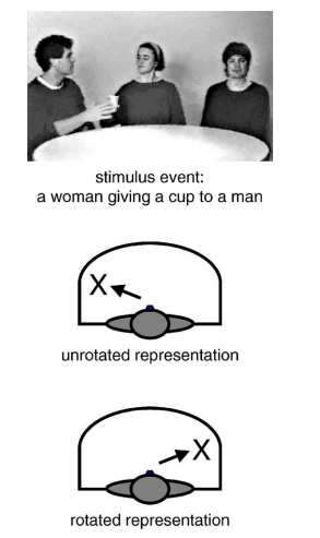 주는 행위의 회전되지 않은 표현과 회전된 표현의 예시. 위치는 행위에서 남자의 위치와 비교하여 표현의 회전을 결정한다.