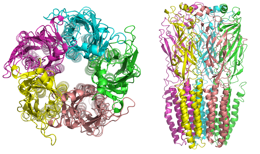 니코틴성 아세틸콜린 수용체(nAChR)는 다양한 구조 상태로 존재할 수 있다. 아세틸콜린(ACh)과 같은 작용제가 결합하면 수용체의 구조가 변하여 채널이 열리는 상태가 안정화된다. 일반적으로 수용체가 열리기 위해서는 정확히 두 개의 ACh 분자가 결합해야 한다.[19]