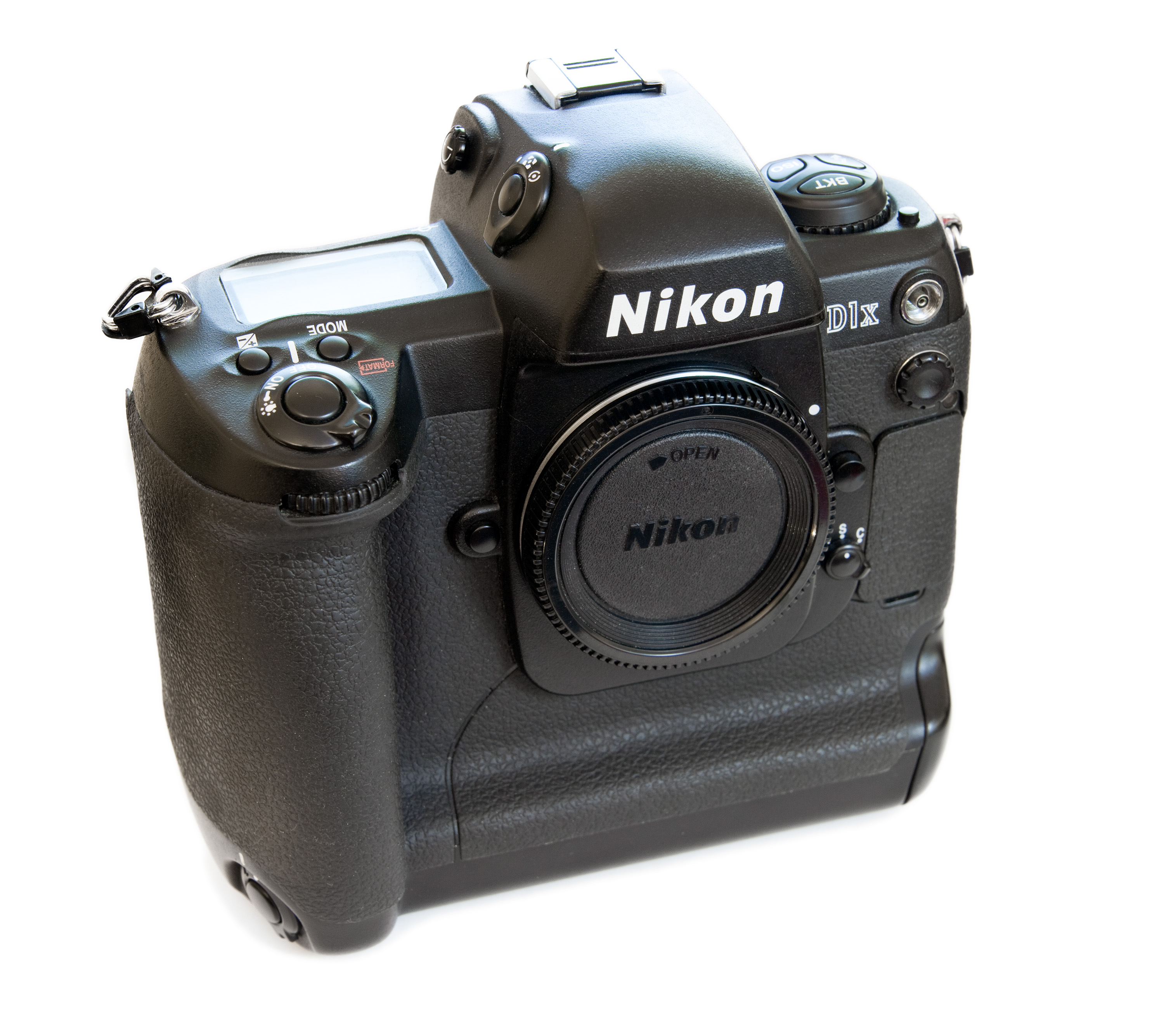 니콘 D1X. D1 시리즈에서 독특하게 D1X는 핸드 그립에 회색 줄무늬가 있었다(사진에는 없음).