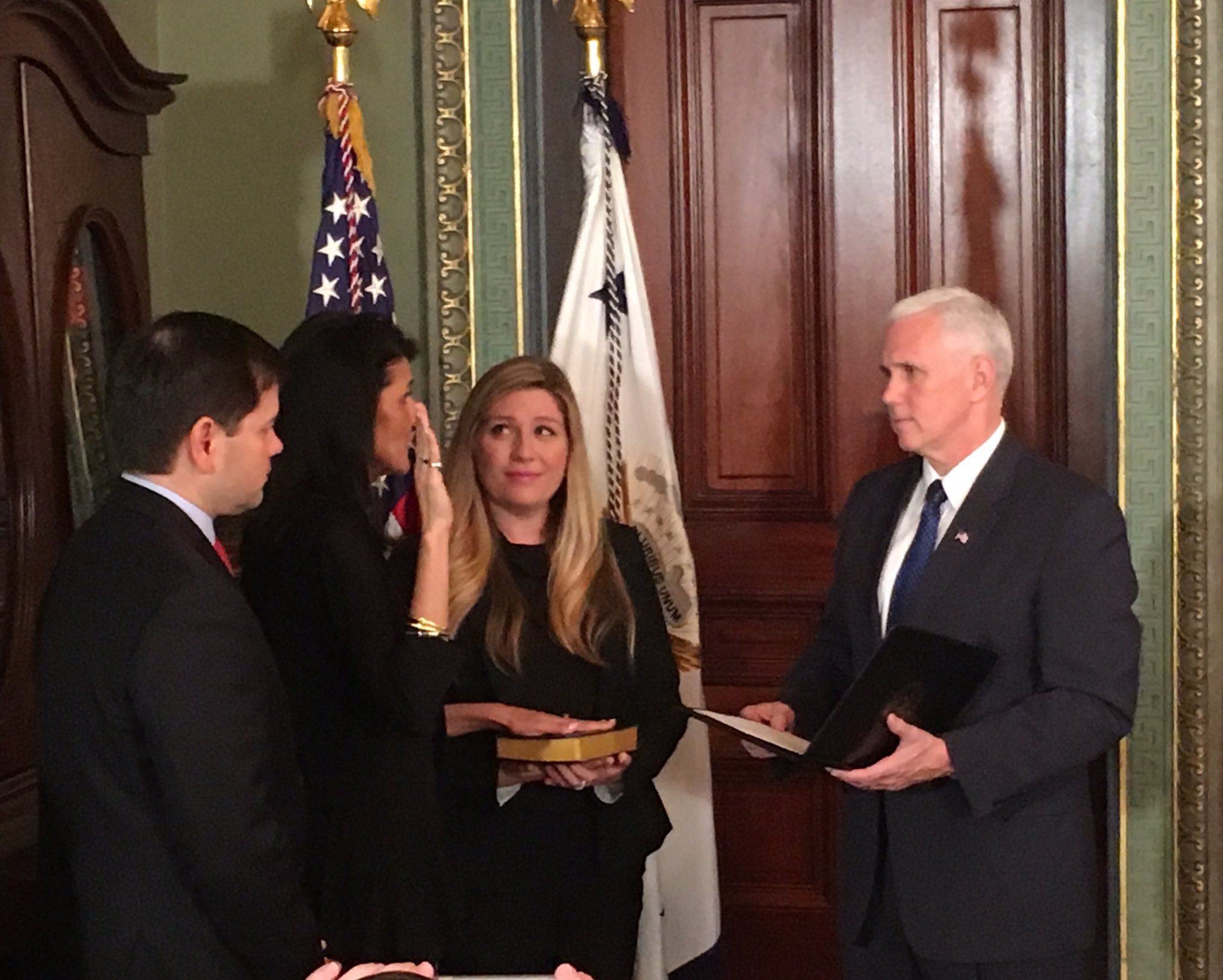 헤일리는 2017년 1월 25일 마이크 펜스 부통령 앞에서 취임 선서를 했다.[144] 이후 1월 27일 뉴욕 시에 있는 유엔 본부에서 안토니우 구테흐스 유엔 사무총장에게 신임장을 제출하며 공식적으로 임기를 시작했다.[145][365] 그녀는 버락 오바마 행정부의 사만다 파워 대사의 후임이었다.[146]