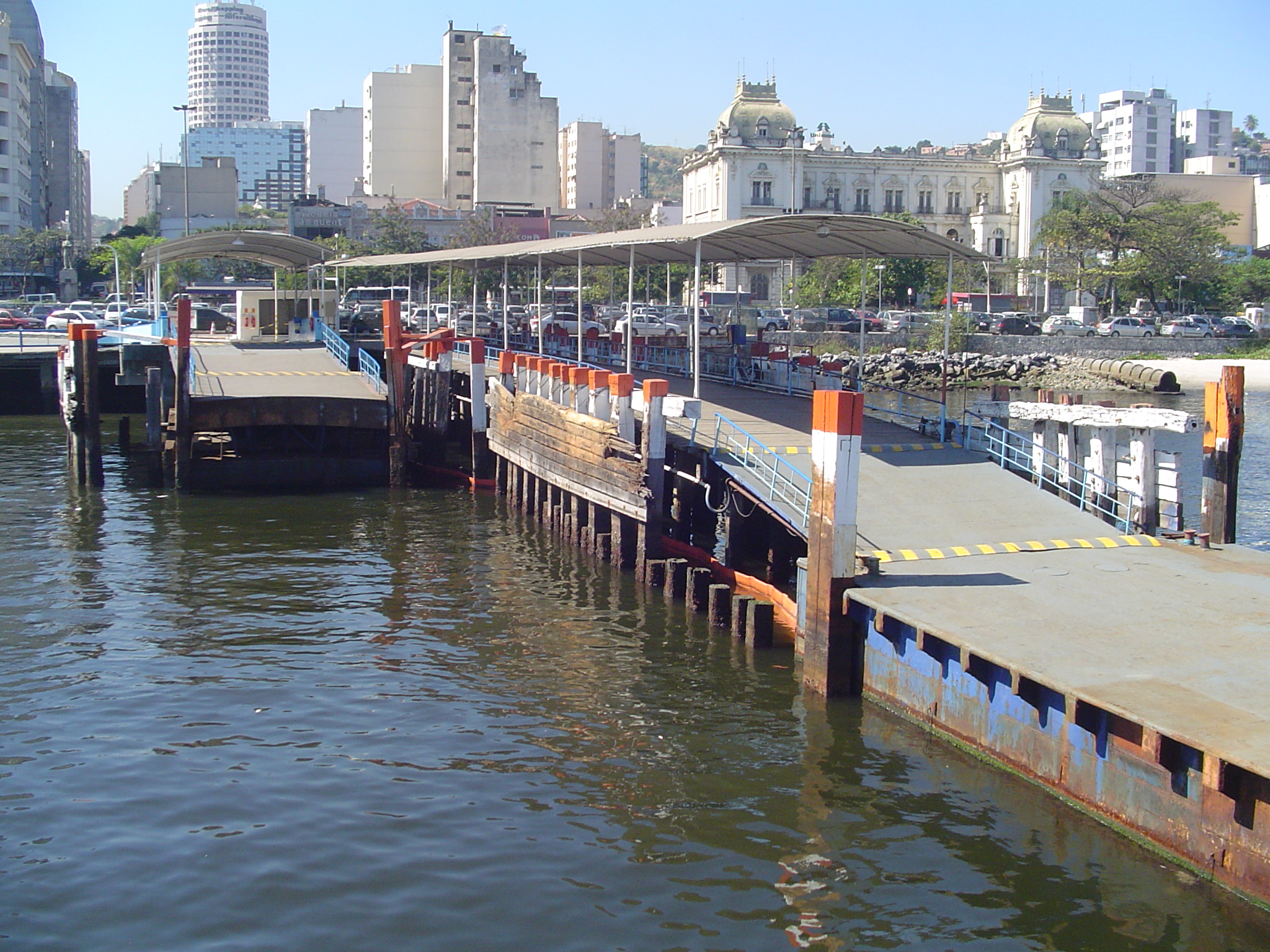 니테로이와 리우데자네이루 시 사이에는 두 개의 페리 노선이 운행 중이다. 두 노선 모두 리우데자네이루 프라사 XV 역을 목적지로 한다. 니테로이의 터미널은 시내 중심부의 아라리보이아 광장과 샤리타스 지역에 있다. 아라리보이아 광장과 프라사 15 드 노벰브루 광장 사이는 최대 2,000명의 승객을 수용할 수 있는 대형 선박을 이용하여 약 20분이 소요된다.2006년부터 대형 선박들은 점차 수용 인원이 적은(최대 1,200명) 대형 쌍동선으로 교체되어, 통항 시간은 12~15분으로 단축되었다. 샤리타스 터미널과 프라사 15 드 노벰브루 광장 터미널 사이는 소형 쌍동선을 이용하며, 이 서비스는 선택적 교통으로 간주된다.