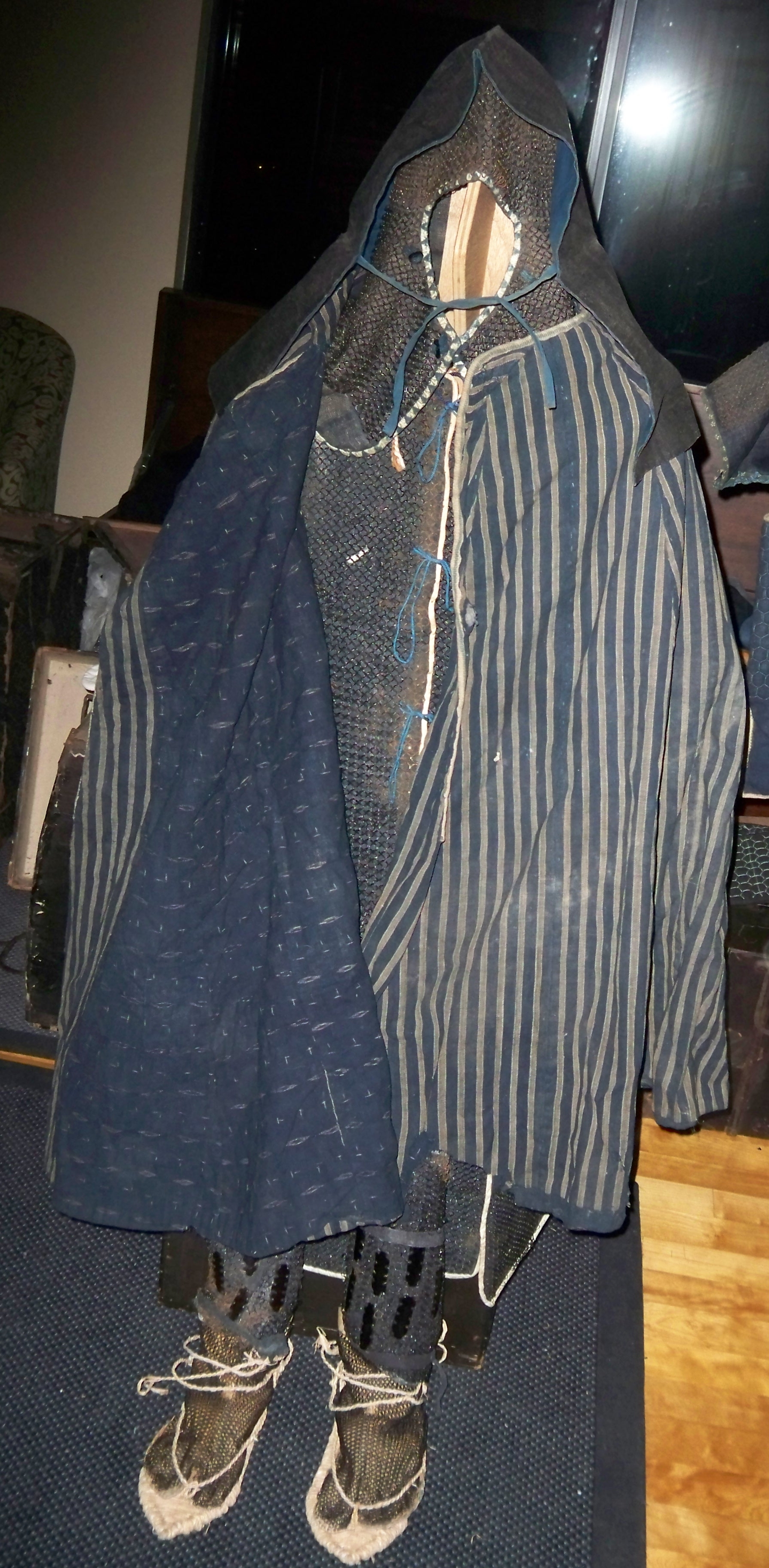 닌자 갑옷에 대한 설명은 검증할 수 없다. 닌자로 여겨지는 유명 인물들의 묘사에서는 종종 일본 갑옷을 착용하는 모습이 나타나며, 여기에는 쿠사리(일본식 체인 갑옷)와 카루타(갑옷)로 제작된 은폐형 갑옷이 포함되어 있으며, 천 겹 사이에 갑옷이 숨겨진 ''카타비라''(재킷)도 닌자가 착용했을 수 있다. 또한, 닌자의 갑옷에는 다리 보호대와 팔 보호대, 금속으로 강화된 두건도 포함되었을 것으로 추정된다.[41]