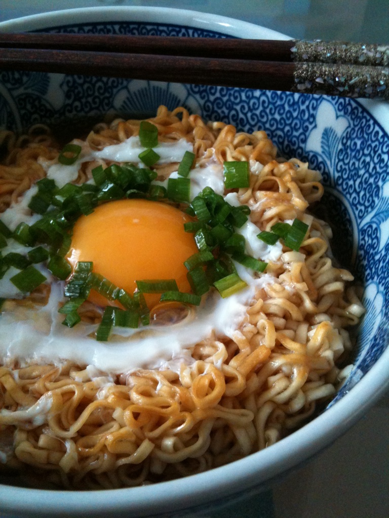 다른 재료와 곁들이는 대표적인 방법으로 면의 파여진 홈을 위로 하여 그릇에 넣고, 위에 달걀을 깨서 넣고 다진 파를 넣어 조리하는 방법이다. 이 조리예는 봉지의 패키지 사진에 인쇄되어 있다.