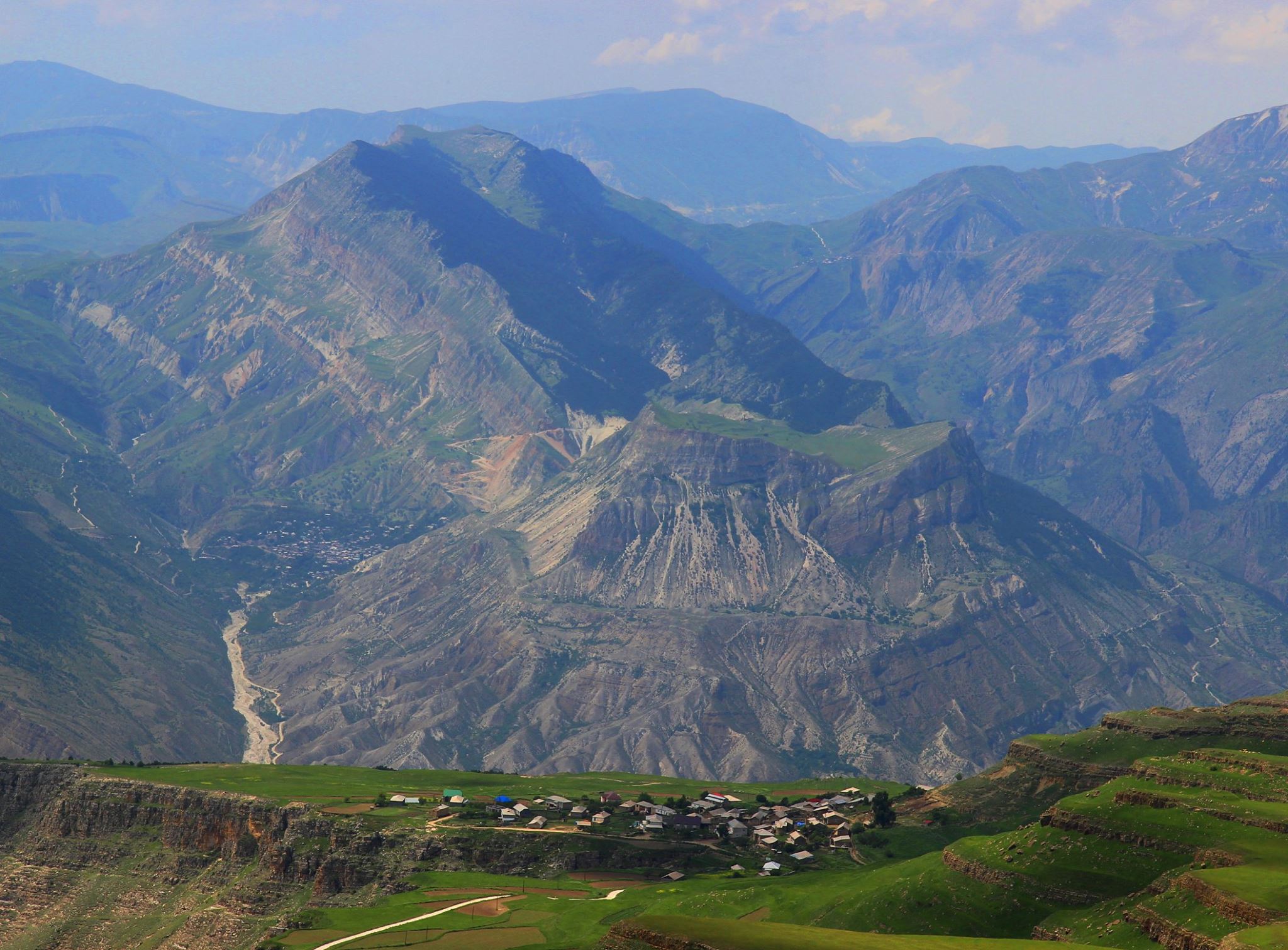 대부분이 산으로 구성되어 있으며, 남쪽에 볼쇼이캅카스산맥이 위치해 있다.[1] 가장 높은 산은 바자르듀지봉(4,466 m)이다.[1]다게스탄의 대부분은 산악 지형이며, 공화국의 남쪽에는 대카프카스 산맥이 펼쳐져 있다.[2] 최고봉은 아제르바이잔과의 국경에 위치한 바자르듀지봉(4,470m)이다.[2] 러시아 최남단 지점은 이 산봉우리에서 남서쪽으로 약 7km 떨어진 곳에 있다.[2] 다른 주요 산으로는 디클로스므타산(4,285m), 고라 아달라 슈켈메즈르 산(4,152m), 고라 듈티다그 산(4,127m)이 있다.[2] 쿠무흐 마을은 산간 지방의 여러 정착지 중 하나이다.[2]