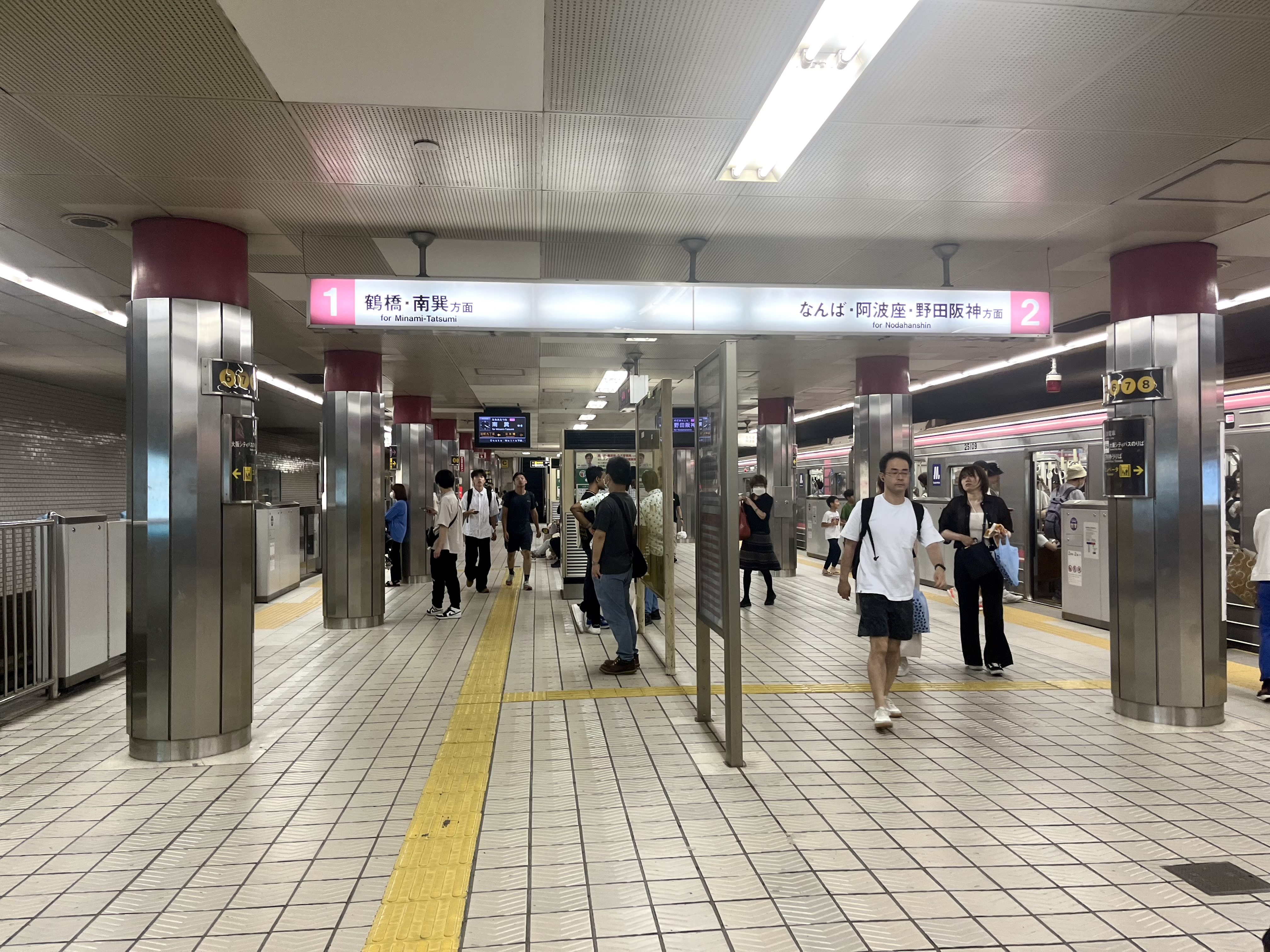 다니마치선은 지하 1층에 상대식 승강장 2면 2선, 센니치마에선은 지하 2층에 스크린도어가 설치된 섬식 승강장 1면 2선으로 되어 있다. 긴테쓰 난바선이 다니마치선 승강장 바로 아래를 지나간다.역 바로 위에 있는 입체 교차 때문에, 다니마치선의 상대식 승강장의 상하선 사이를 비워두고 전기실, 기계실로 사용하고 있다. 다니마치선 승강장 중앙 부근에 센니치마에선 승강장 난바 방면으로 연결되는 연락 계단이 있으며, 센니치마에선 승강장 난바 방면은 다니마치선 승강장의 개찰구 안 연락 통로를 겸하고 있으며, 노다한신역행 열차가 정차한다(2013년 12월 21일 첫차부터[3]). 전날까지는 미나미타쓰미역행 열차와 마찬가지로, 동쪽 개찰구 쪽에 정차하고 있었다. 개찰구 밖에도 연락 통로가 있다.