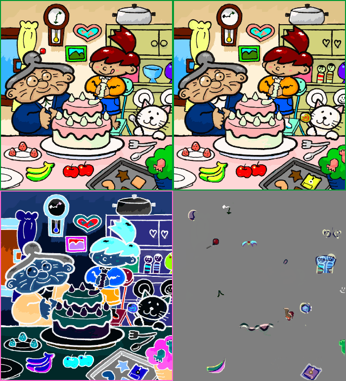 디지털 방식으로 다른 그림 찾기 퍼즐을 푸는 한 가지 방법은 비교할 이미지 중 하나의 반전된 이미지를 만들고 다른 이미지에 50% 오버레이하는 것이다.