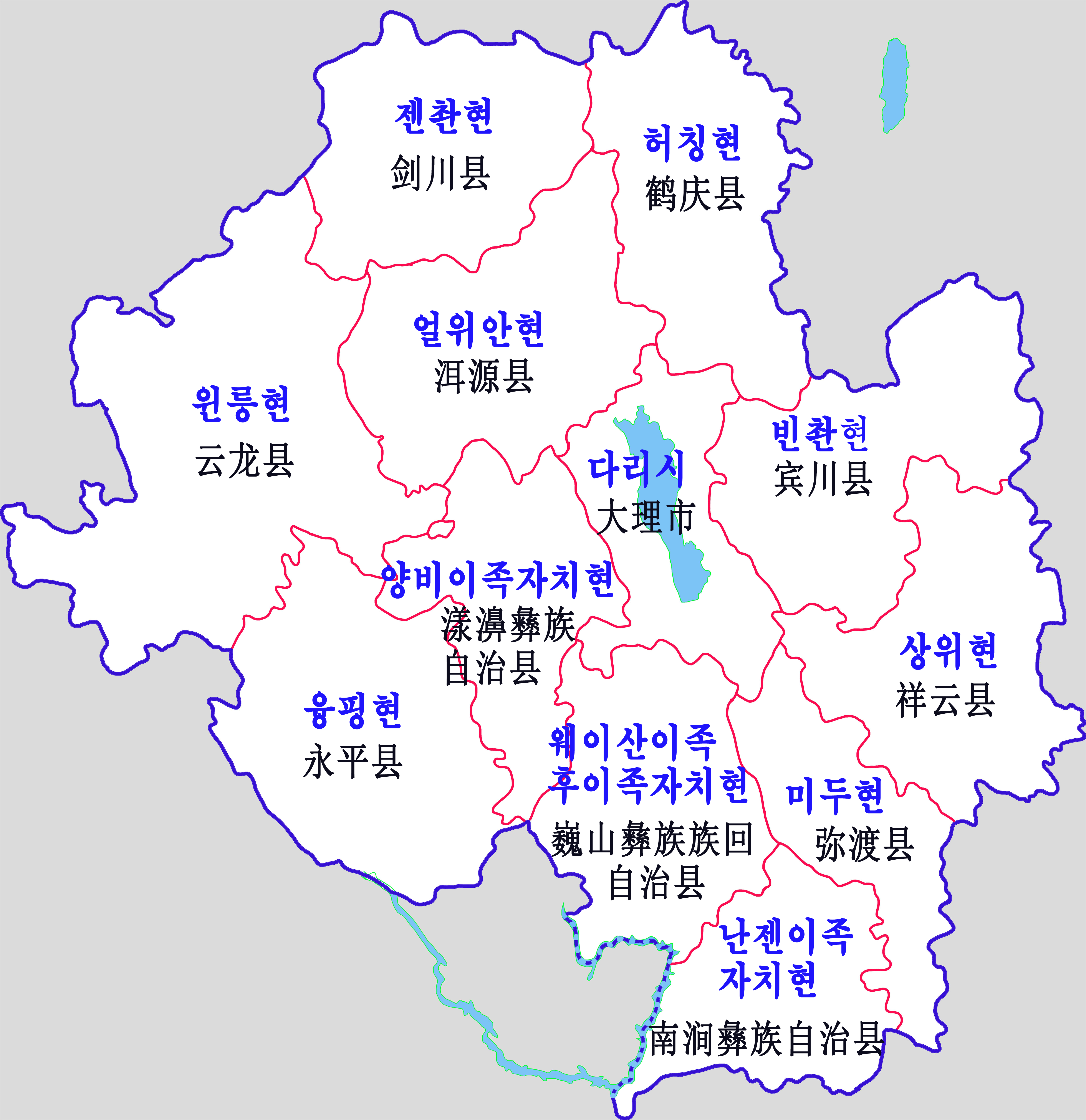 다리 바이족 자치주는 1개의 현급시, 8개의 현, 3개의 자치현으로 구성된다.이름 | 간자 |