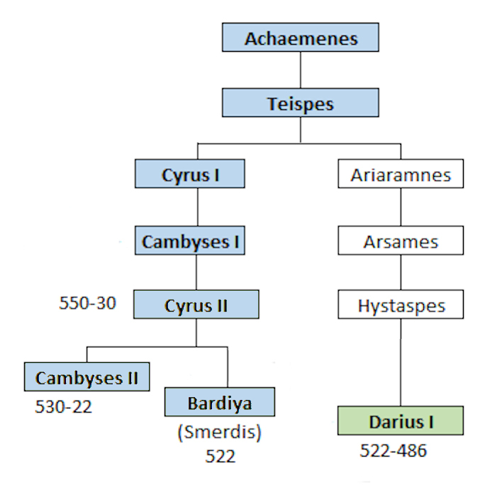 다리우스 1세는 키루스 2세, 캄비세스 2세에 이어 아케메네스 제국의 세 번째 왕으로 알려져 있다. 그러나 베히스툰 비문에 따르면, 그는 스스로 아케메네스 가문의 9대 왕이라고 주장했다[35]。