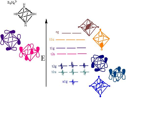 ''클로소''-B6H62−의 경우, 붕소 원자는 팔면체의 각 꼭지점에 위치하며 sp 혼성화를 한다.[11] 하나의 sp-혼성 궤도는 구조 바깥쪽으로 향하여 수소 원자와의 화학 결합을 형성한다. 다른 sp-혼성 궤도는 구조의 중심부로 향하여 클러스터 중심에 큰 결합 분자 궤도를 형성한다. 나머지 두 개의 비혼성화 p 궤도는 구형 구조의 접선을 따라 위치하며 붕소 꼭지점 사이에 더 많은 결합 및 반결합 궤도를 생성한다.[9]