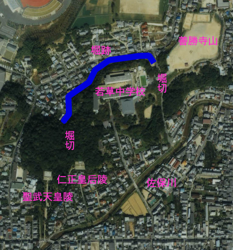 와카쿠사 중학교 서쪽 부지는 학교 건물이 들어서지 않아 구루와(曲輪, 성곽 내부 구역)의 면이 비교적 잘 남아 있다. 이 구역 북서쪽에서 서쪽에 걸쳐 높이 1.5m의 토루가 있으며, 모퉁이 부분은 높이 3m, 폭 2m의 단(壇) 모양을 이루고 있어 망루 터 중 하나였을 것으로 추정된다.