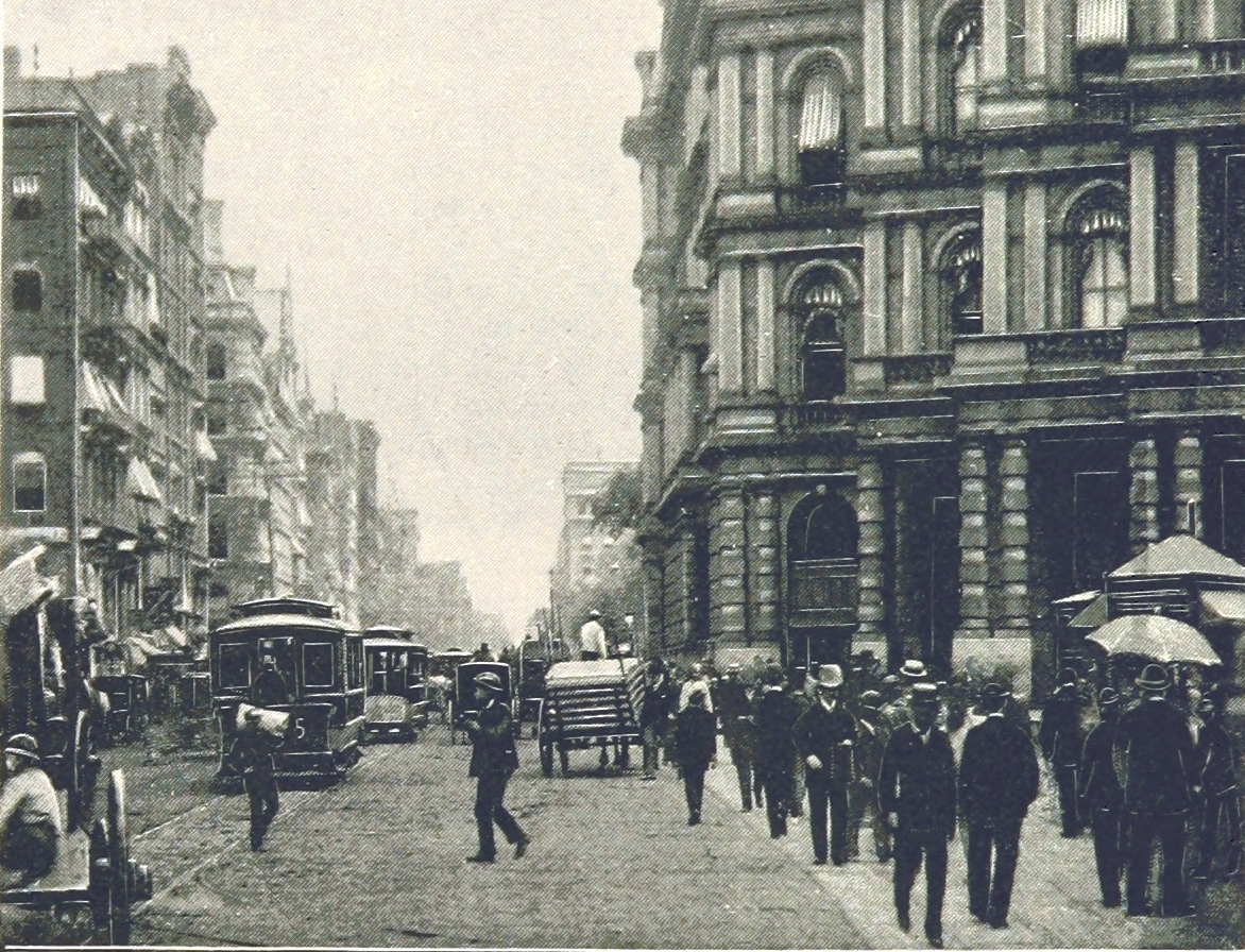 미국의 다운타운은 법적 경계가 없었고, 대부분 여러 구역의 일부였다. 하지만 모든 노면 전차와 고가 철도가 모이고, 기차 터미널이 있어서 찾기 어렵지 않았다. 대형 백화점, 호텔, 극장, 클럽, 카바레, 댄스홀이 있었고, 마천루가 건설되었다. 처음에는 도시에서 유일하게 전기가 공급되는 곳이었다. 교통 체증이 심했지만 해결책은 없었다.[10]