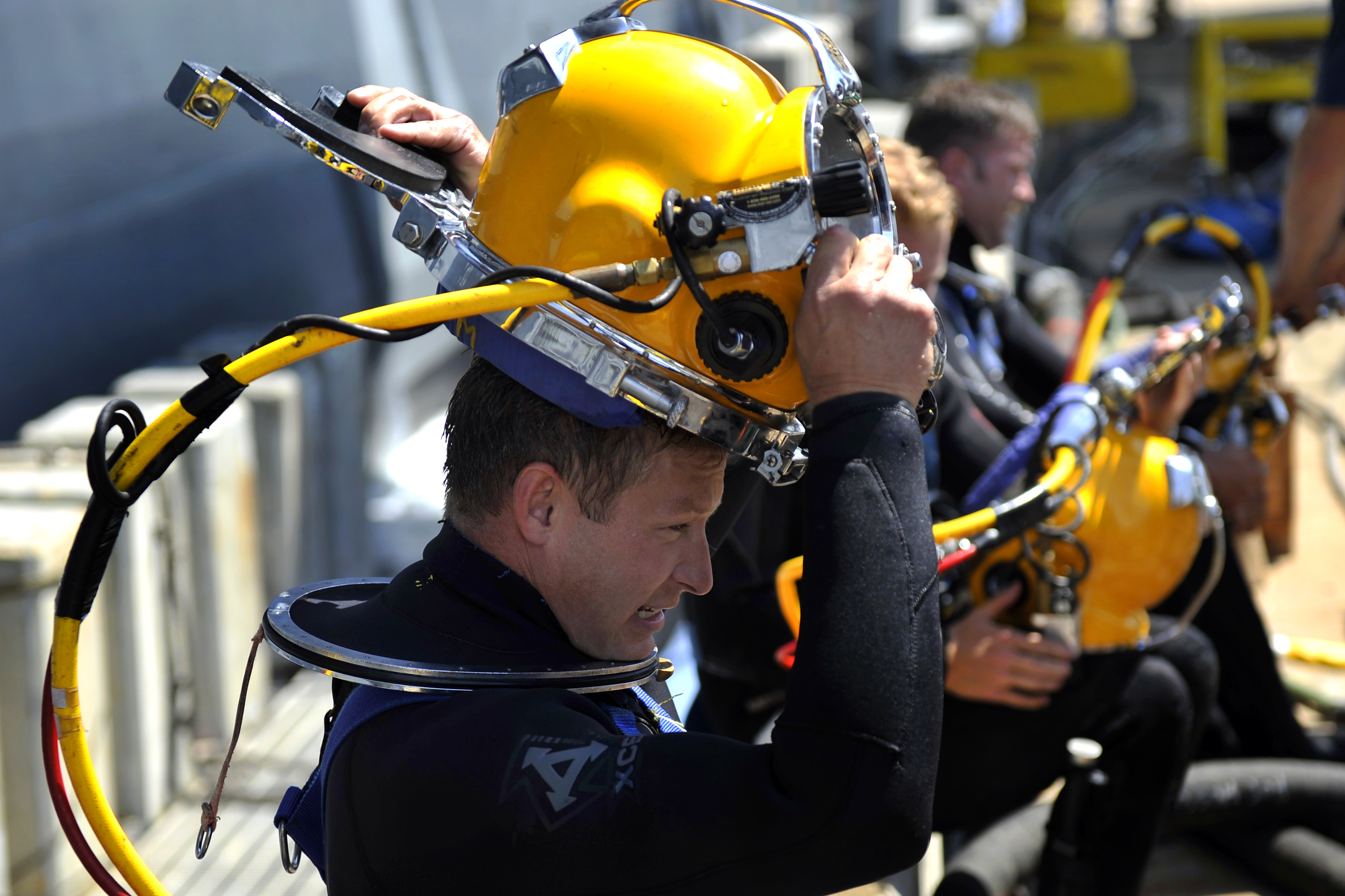 - 표준 다이빙 헬멧 (Copper hats): 구리 헬멧(보닛)과 흉갑(코르셋)이 결합된 형태로, 잠수복과 밀폐되어 방수 기능을 한다. 호스를 통해 공기나 헬륨 혼합 가스를 공급받고 배기 밸브로 배출한다. 존 스코트 홀데인은 헬멧 내 이산화탄소 축적 문제를 해결하기 위해 최소 유속 기준을 설정했다.[69] 제2차 세계 대전 당시 미국 해군은 이산화탄소 스크러버 챔버를 추가하여 개조한 Mk V 헬리옥스 헬멧을 제작했다.[32]