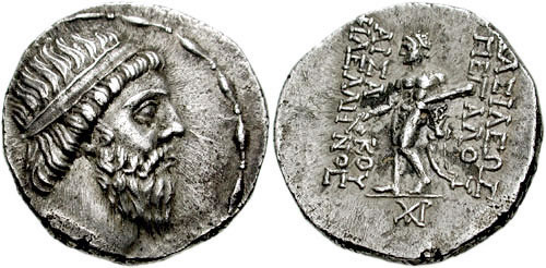 다이아뎀을 착용한 미트리다테스 1세가 양각된 드라크마 주화.