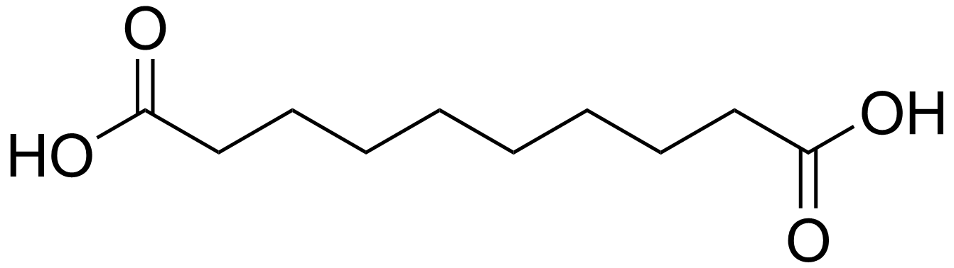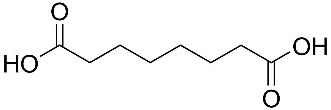 아젤라산: 올레산 또는 엘라이드산을 질산(azote|아조트프랑스어, 질소 또는 azotic, 질산)으로 산화시키는 과정에서 이름이 유래되었다. 썩은 지방의 생성물에서 검출되었으며, 아마인유나 고대 이집트 연고에서도 발견된다. 과거에는 과망간산 칼륨으로 올레산을 산화시켜 제조했지만, 현재는 크롬산으로 올레산을 산화 절단하거나 오존 분해하여 제조한다. 아젤라산은 단순 에스테르 또는 분지쇄 에스테르 형태로 염화 비닐 수지나 고무의 가소제, 윤활제, 구리스 제조에 사용된다. 또한 화장품 분야에서 여드름 치료 목적으로 사용되는데, 피부의 호기성 및 혐기성 미생물에 대해 세균 정지 및 세균 살균 특성을 나타낸다. 식물의 감염 저항성을 향상시키는 분자로도 확인되었다.[2]