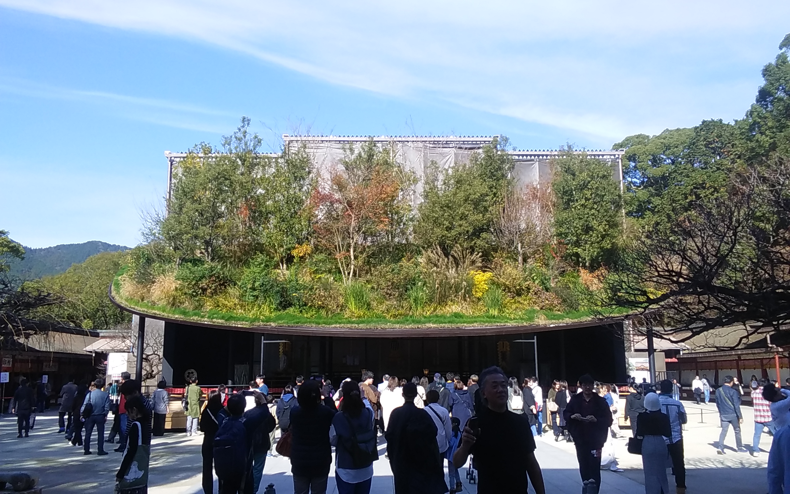 2023년 5월부터 본전은 124년 만에 처음으로 보수 공사를 진행 중이다.[8] 건축가 후지모토 소가 설계한 임시 건물이 본전 앞에 세워졌으며, 약 3년으로 예상되는 보수 공사 기간 동안 그곳에 남게 된다. 임시 건물 지붕에는 일본 매실나무를 포함한 46종의 식물이 심어져 있다.[8]