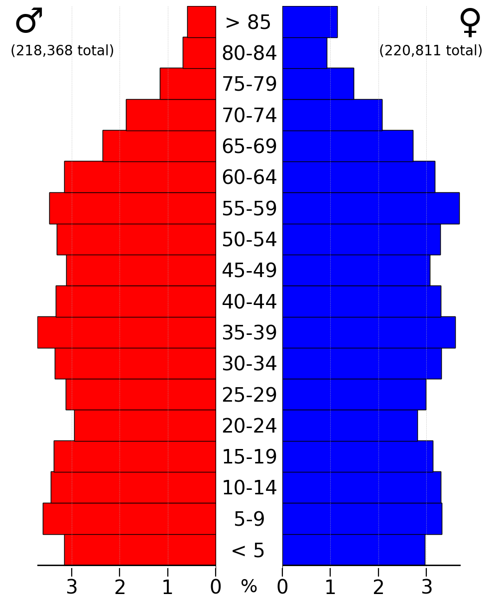 주민 중 29.20%는 18세 미만, 18세 이상 24세 이하 7.90%, 25세 이상 44세 이하 34.30%, 45세 이상 64세 이하 21.20%, 65세 이상은 7.40%이다. 중앙값 연령은 34세이다. 여성 100명당 남성은 97.60명이며, 18세 이상 여성 100명당 남성은 94.70명이다.
