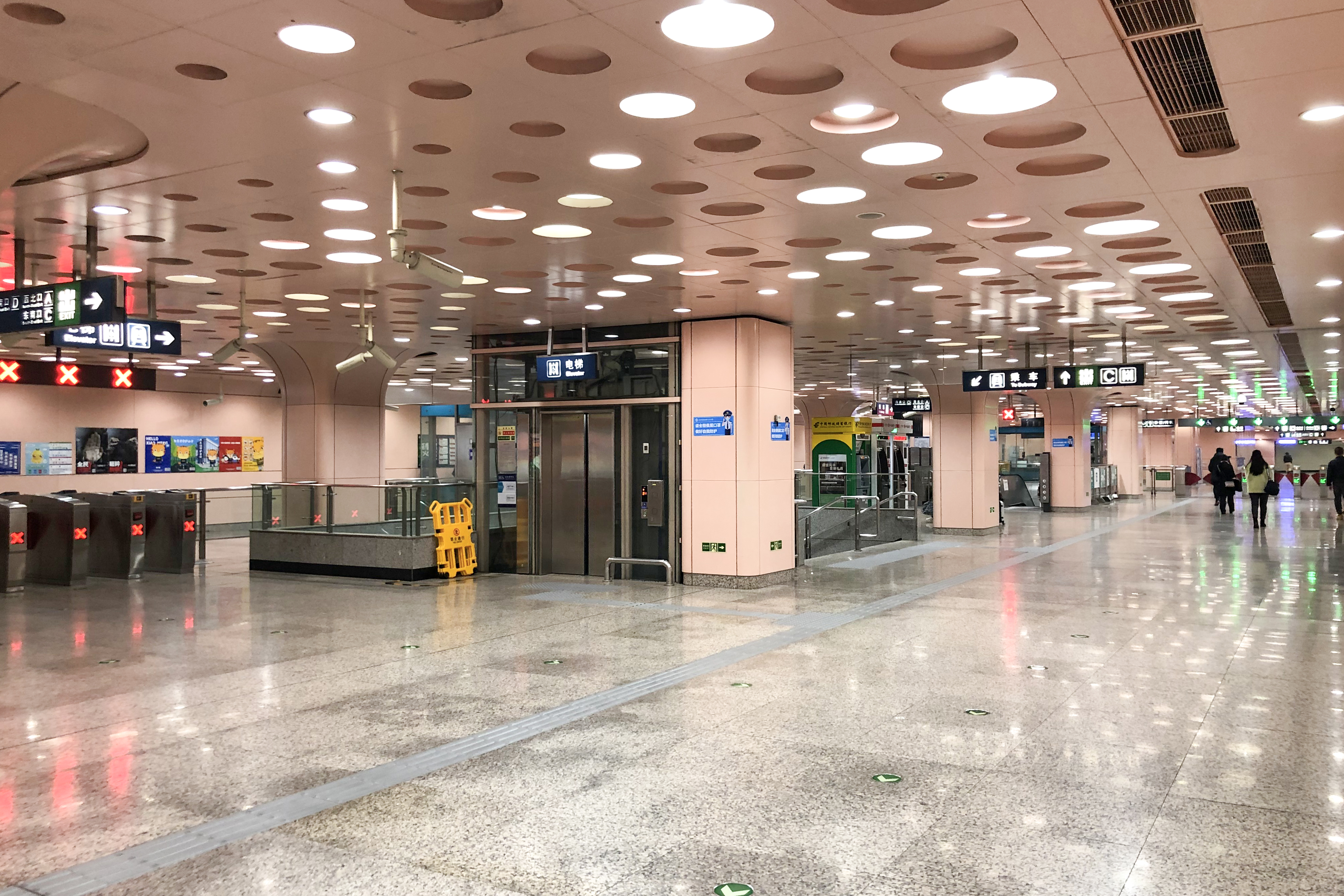 (미사용)8호선 주신좡 방면(하이후툰)섬식 승강장, 왼쪽 출입문이 열림 (미사용)→8호선 잉하이 방면 (다훙먼난)