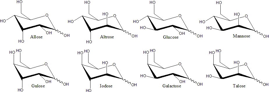 헥소스 (6개) | 알로스, 타로스, 포도당, 알트로스, 만노스, 갈락토스, 이도스 | 프시코스, 과당, 소르보스, 타가토스 |