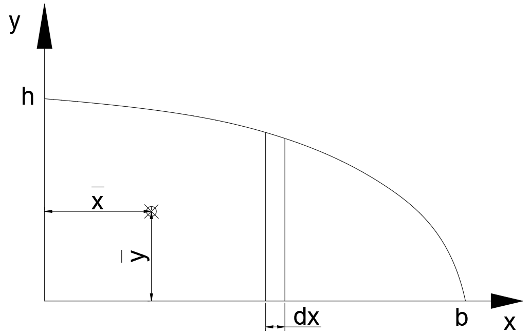 포물선 과 x축, y축으로 둘러싸인 영역(0 ≤ x ≤ b)의 도심을 라고 하자. 이 영역 내의 미소 면적 dA는 다음과 같이 정의할 수 있다.