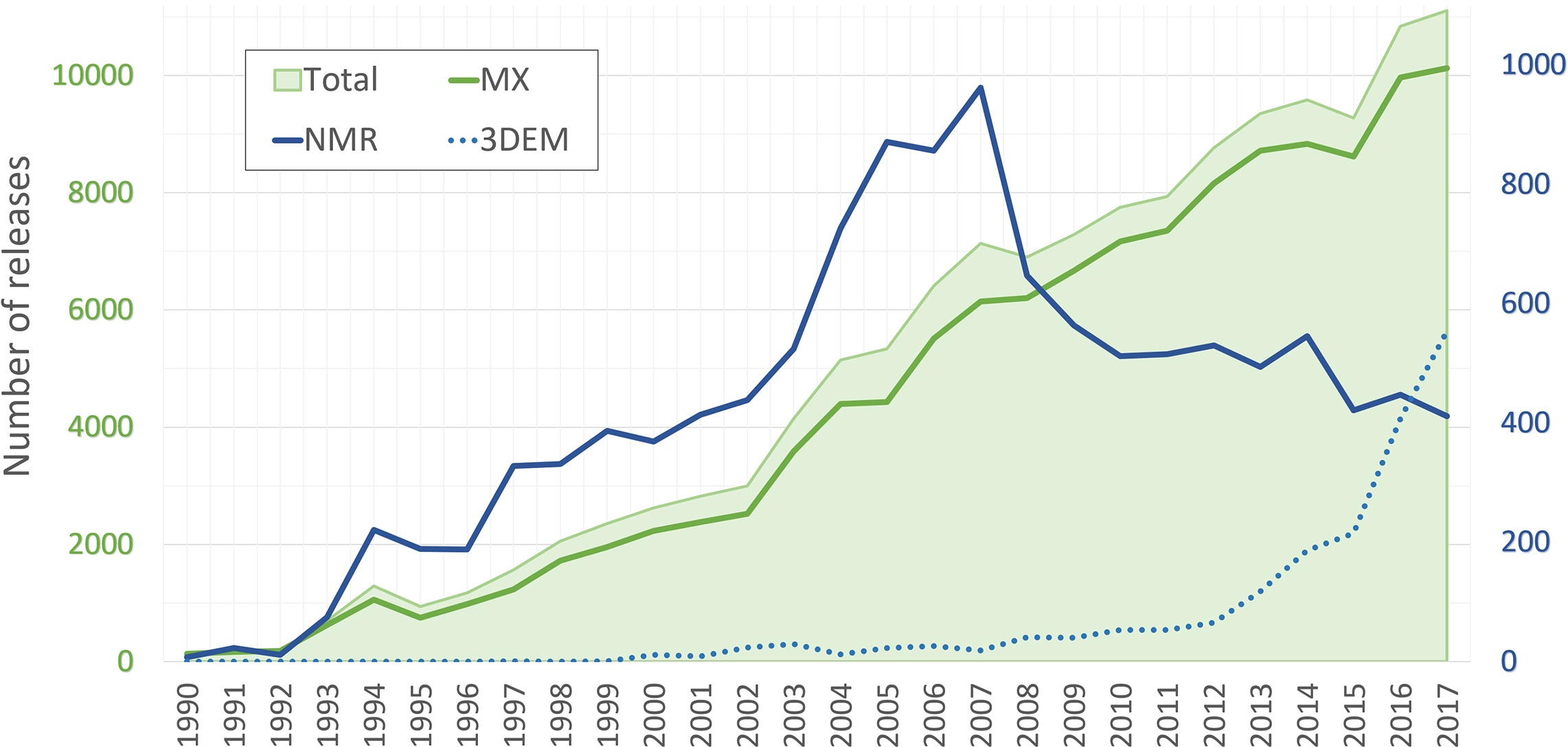 PDB에 등록된 구조 데이터는 연도별, 분석 방법별로 다음과 같이 분류할 수 있다.