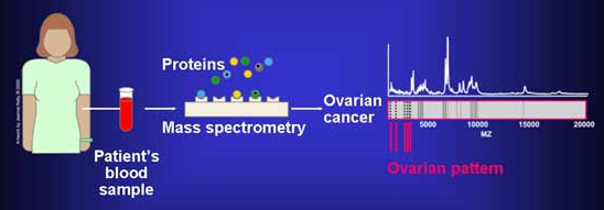 생체 지표는 질량 분석법 기반 단백체 분석을 통해 암에서 발견되었다. 단백체학, 즉 단백체 연구는 환자의 특정 단백체 및 유전체 프로파일에 따라 약물 칵테일을 맞춤화하는 맞춤형 의료의 진전이다.[8] 난소암 세포 계열 분석 결과, 난소암의 잠정적인 생체 지표에는 "α-에놀라제(ENOA), 신장 인자 Tu, 미토콘드리아(EFTU), 글리세르알데히드 3-인산 탈수소효소(G3P), 스트레스-70 단백질, 미토콘드리아(GRP75), 아포지단백질 A-1(APOA1), 퍼옥시레독신(PRDX2) 및 안넥신 A(ANXA)"가 포함된다.[9]