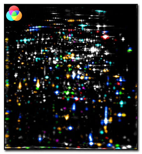 단백질체학은 단백질체를 연구하는 분야로, 주로 2차원 젤 전기영동을 통해 단백질을 분리하는 방식으로 수행되어 왔다. 1차원에서는 단백질을 전하를 기준으로 분리하는 등전점 포커싱을 사용한다. 2차원에서는 분자량을 기준으로 SDS-PAGE를 사용하여 단백질을 분리한다. 젤은 단백질을 시각화하기 위해 염색 시약인 쿠마시 브릴리언트 블루 또는 은 염색으로 염색한다. 젤 위의 점들은 특정 위치로 이동한 단백질이다.4. 2. 질량 분석법 (Mass Spectrometry)
