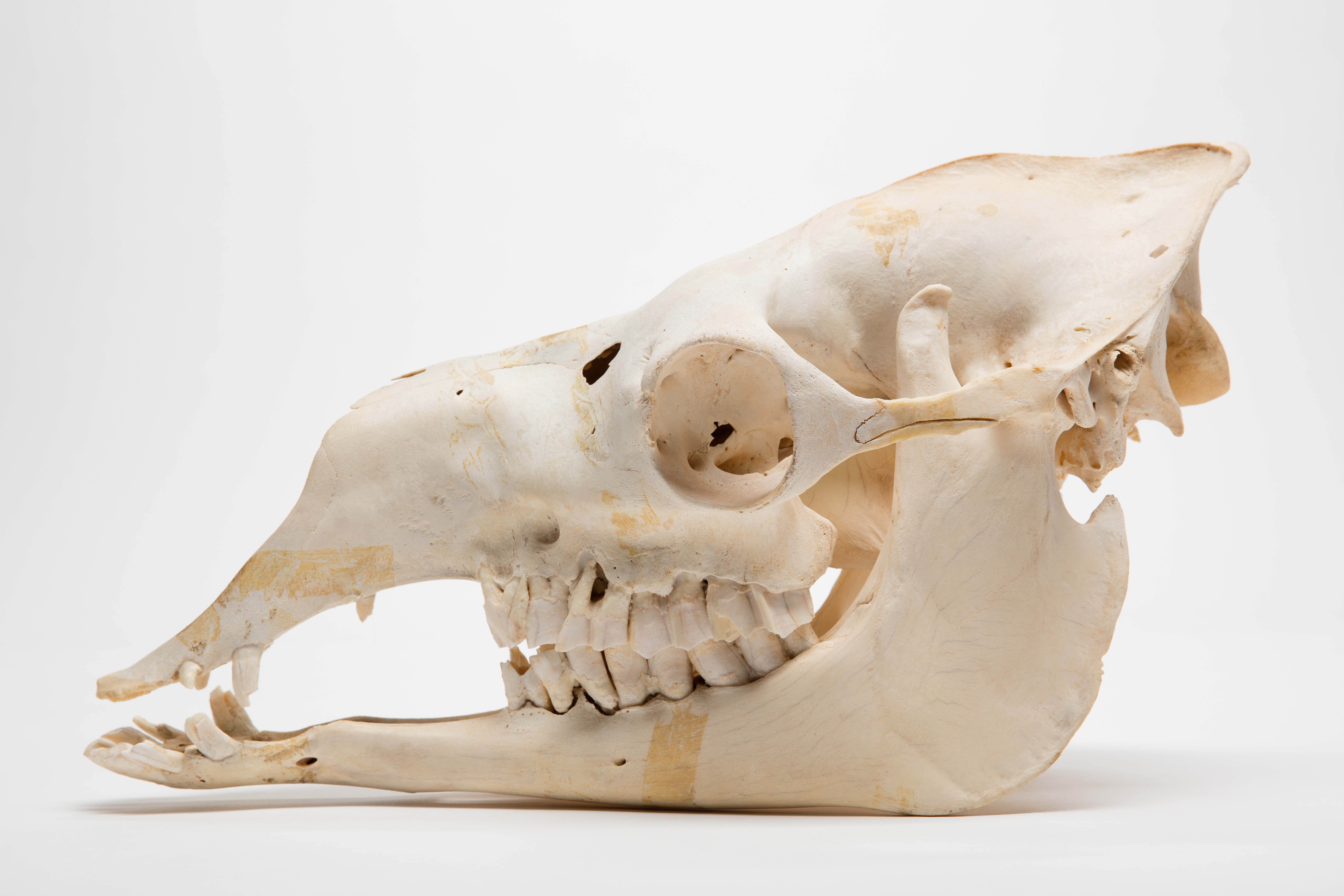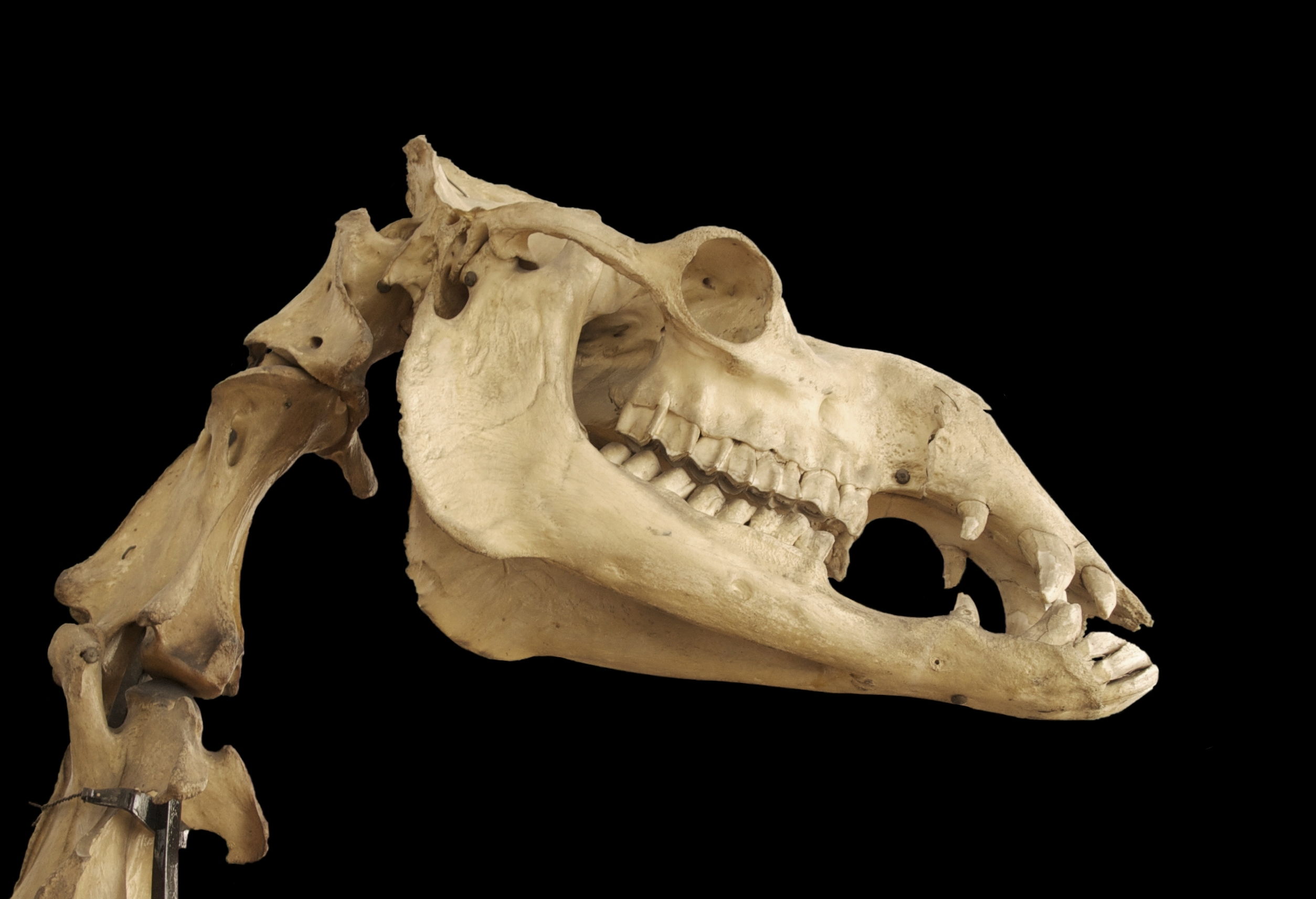 두개골의 두드러지는 특징은 광대뼈와 이마뼈 및 그 연결뼈, 해면질로 가득 찬 고실포(鼓室胞), 두개골 이음매 부분의 금을 따라 잘 발달된 시상능(矢狀稜)이라 불리는 돌기, 길쭉한 얼굴과 들쑥날쑥한 코뼈이다.[187] 가슴에는 장기를 감싸는 8쌍의 복장뼈와 4쌍의 다른 갈비뼈가 있으며,[183] 길쭉한 척추는 거의 214cm에 달한다. 척추가 끝나는 곳에는 2·3번째 엉치뼈가 자리 잡고 있으며,[188] 종아리뼈는 복사뼈로 들어가 있다. 지행성(趾行性) 동물로, 골격으로 볼 때 두 발가락 마디만을 땅에 딛고 걸으며, 다른 동물들에게 두 번째와 다섯 번째에 해당하는 발가락이 없다.[189] 앞발은 좌우로 잰 너비가 19cm이고 앞뒤로 잰 길이가 18cm이며, 뒷발은 너비 17cm에 길이 16cm이다.[184]