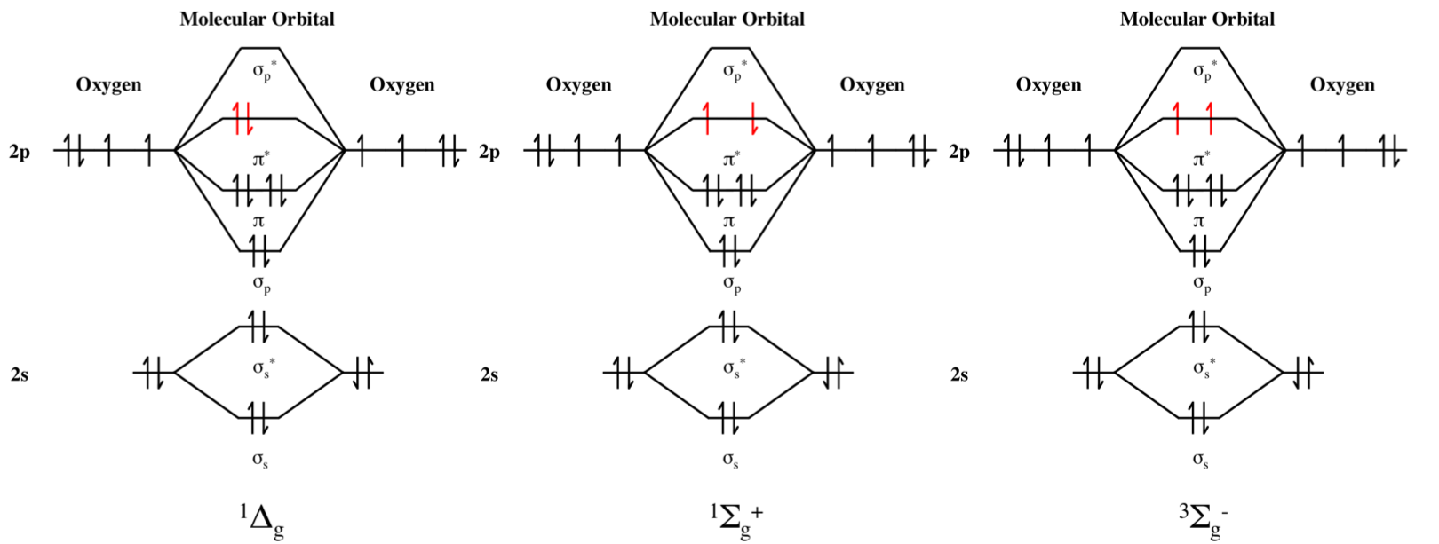 산소 분자의 들뜬 일중항 상태에는 두 가지가 있다. 2개의 π*2p 궤도에 각각 1개씩의 전자가 점유하고 있는 Σ 상태와, 2개의 π*2p 궤도 중 하나만 2개의 전자가 점유하고 다른 π*2p 궤도는 빈 궤도인 Δ 상태가 존재한다. Σ 상태보다 Δ 상태가 에너지가 낮기 때문에, Σ 상태는 빠르게 Δ 상태로 전이한다.
