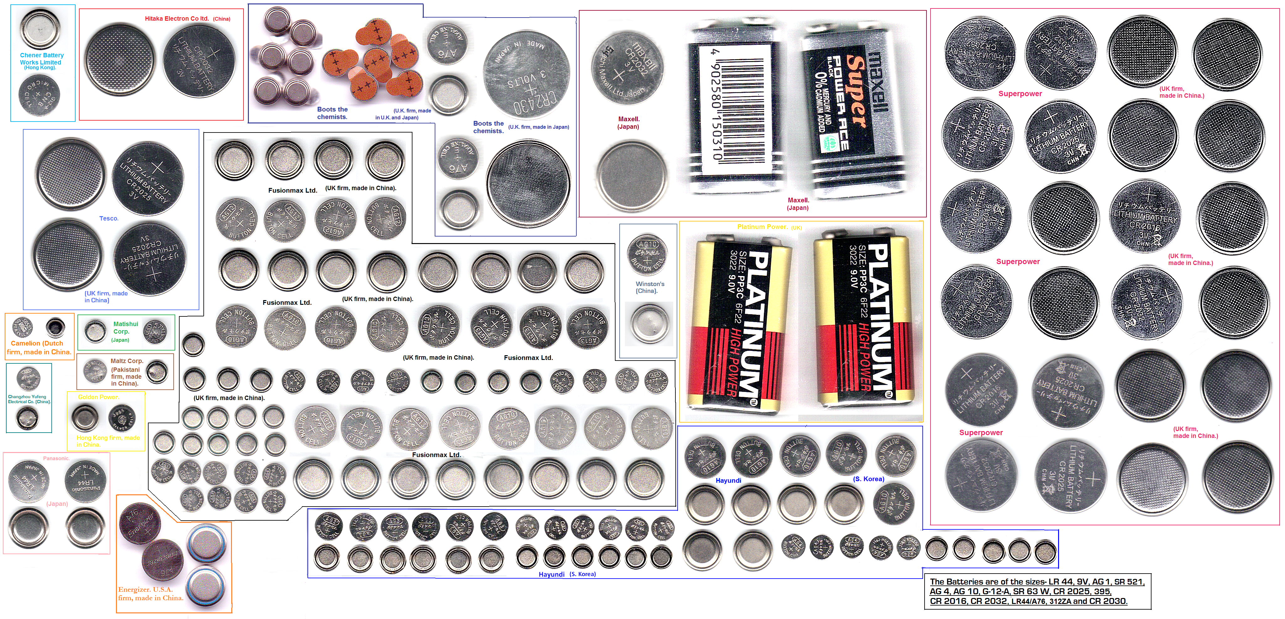 • 알칼리 전지: 다른 유형과 같은 버튼 크기로 만들어지지만, 일반적으로 산화은 전지나 리튬 전지보다 용량이 적고 전압이 불안정하다.[3]