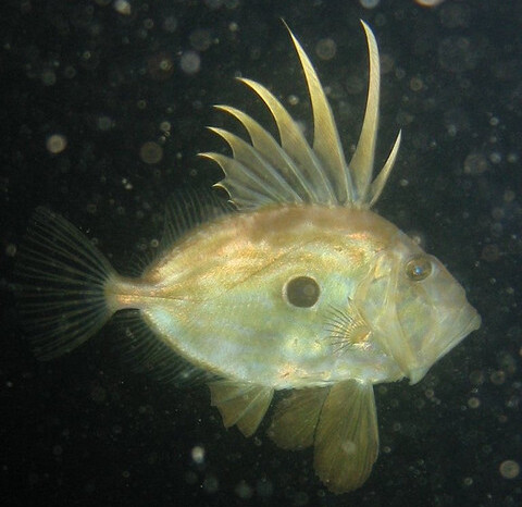 몸이 옆으로 높이 압축되어 있어 정면에서는 거의 보이지 않는다. 머리 앞쪽에 있는 큰 눈은 먹이를 잡는 데 필요한 양안 시력과 깊이 인식을 제공한다. 이 눈점은 먹이를 혼란시켜 입으로 빨려 들어가게 할 수 있다.[8]