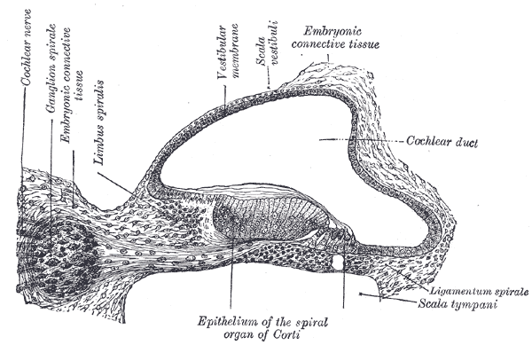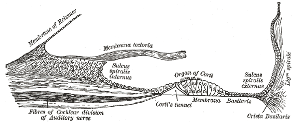 달팽이관의 세로 방향 단면. (달팽이신경은 그림의 중간에 줄무늬가 쳐져 있다.)