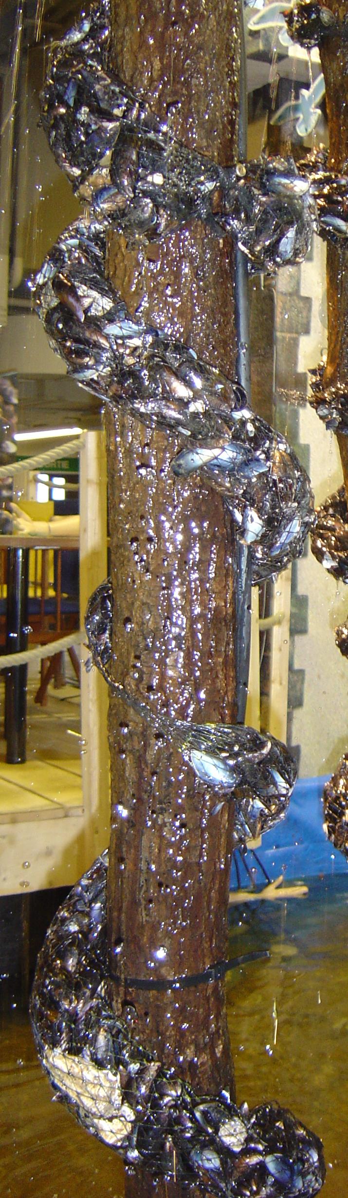 - '''부쇼 양식:''' 조간대 성장 기술 또는 부쇼 기술이라고 불린다. 부쇼라고 알려진 말뚝이 바다에 심어진다. 담치가 자라는 로프는 말뚝에 나선형으로 묶여 있으며, 일부 메쉬 네팅은 담치가 떨어지는 것을 방지한다. 이 방법은 확장된 조수 구역이 필요하다.