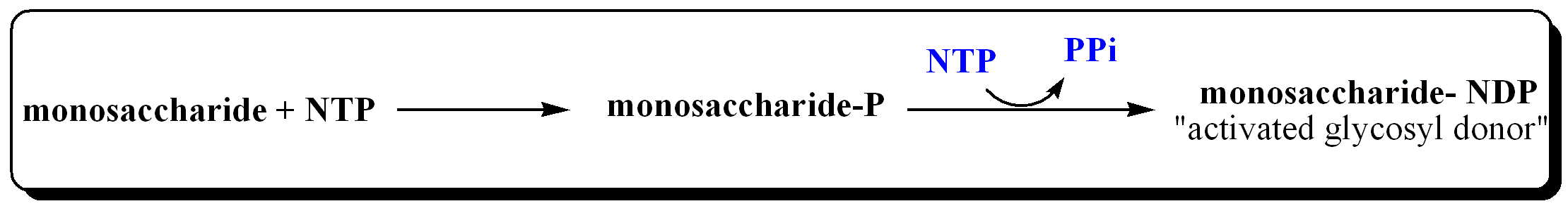 글리코실기 공여체가 역할을 하려면 이러한 단당류가 높은 에너지 상태로 존재해야 한다. 이것은 뉴클레오사이드 삼인산(NTP)과 글리코실 일인산(아노머 탄소에 인산기가 결합된 형태) 사이의 반응 결과로 생성된다. 최근 많은 글리코실트랜스퍼레이스 촉매 반응이 가역적이라는 사실이 밝혀지면서, 당뉴클레오타이드를 '활성화된' 공여체로만 간주하는 것에 대한 의문이 제기되고 있다.[19][20][21][22][23]