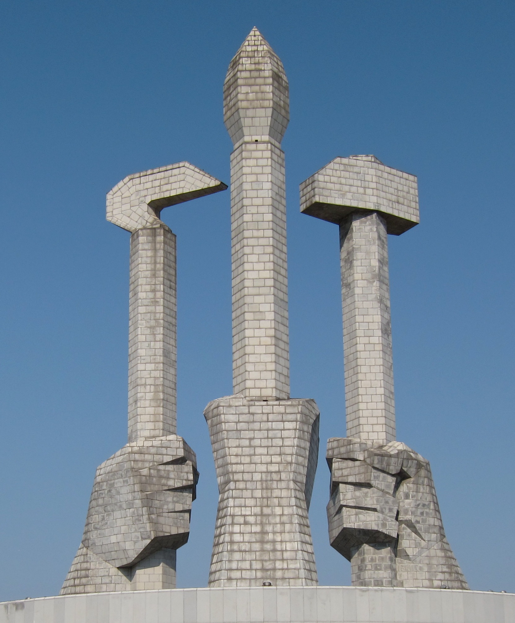 기념비의 세 개의 가장 높은 요소는 망치, 낫, 붓을 쥐고 있는 세 개의 꽉 쥔 주먹을 특징으로 한다. 망치와 낫은 노동자와 농민을 상징하고, 붓은 지식인을 상징한다. 이 삼위일체는 조선로동당의 상징을 기반으로 한다.[8] 이 기념비는 당 창건 50주년을 기념하여 높이 50 미터에 달한다.[9]