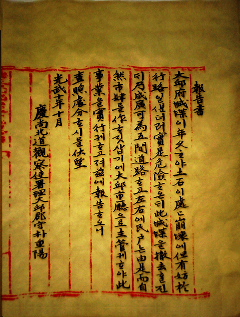 대구읍성의 성벽은 지금의 대구 시가지 중심부를 에워싸고 있는 동성로와 서성로, 남성로, 북성로 거리를 잇는 구간을 따라 서 있었다. 읍성 안에는 경상감영을 중심으로 대구부 관청들이 있었고, 남서부와 동남부를 중심으로 백성들의 주거지역이 있었다. 특히 서문시장은 전국 3대 시장 중 하나로 명성이 높았다.1870년 흥선대원군의 명으로 대구읍성이 중수되었으나, 강화도조약 이후 일본인들이 대구에 들어와 정착하기 시작했다. 1900년 일본인회가 설립되고, 1903년 경부선 철도 공사가 시작되면서 일본인들은 대구로 몰려들었다. 1904년에는 일본인 수가 1천여 명에 달했고, 일본인 상인들은 통감부의 보호를 받으며 조선의 물자를 일본으로 수출하고 일본산 제품을 수입했다. 제일은행 출장소가 대구에 세워지고 일본 화폐가 유통되기 시작했다.