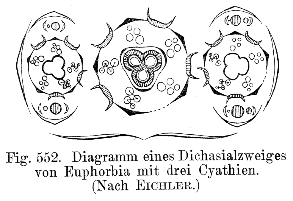Euphorbia영어속의 꽃은 사이아튬(배상꽃차례, cyathium)이라고 하는 머리 모양으로 나타난다. 사이아튬 머리 안의 각 수꽃 또는 암꽃은 생식에 필요한 부분만 가지고 있으며, 수꽃은 수술, 암꽃은 암술을 가지고 있다. 꽃은 꽃가루 매개자를 유인하기 위한 꽃받침, 꽃잎, 또는 꿀샘이 없지만, 식물의 다른 비꽃 부분은 유사한 역할을 하는 외관과 꿀샘을 가지고 있다. Euphorbia영어속은 이러한 종류의 꽃 머리를 가진 것으로 알려진 유일한 식물이다.[14]