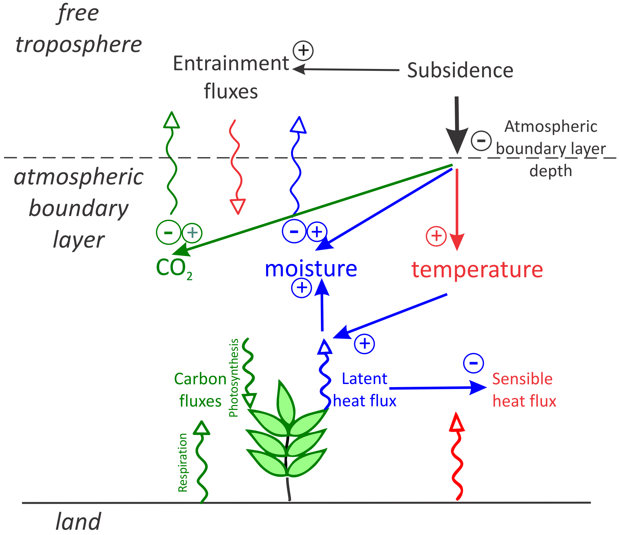 결합된 육지-ABL 시스템에서 탄소(녹색), 물(파란색), 열(빨간색) 순환 간의 상호 작용. 대기 경계층이 침강으로 인해 높이가 감소함에 따라 온도가 상승하고 수분이 감소하며 CO2가 고갈된다. 이는 토양의 증발산(토양으로부터의 증발과 식물의 증산)이 증가하여 하층의 수분 손실을 보상하지만 점차 토양 건조를 유발하는 육지 표면 생태계의 반응을 의미한다. (출처: Combe, M., Vilà-Guerau de Arellano, J., Ouwersloot, H. G., Jacobs, C. M. J., and Peters, W.: Two perspectives on the coupled carbon, water and energy exchange in the planetary boundary layer, Biogeosciences, 12, 103–123, https://doi.org/10.5194/bg-12-103-2015, 2015)