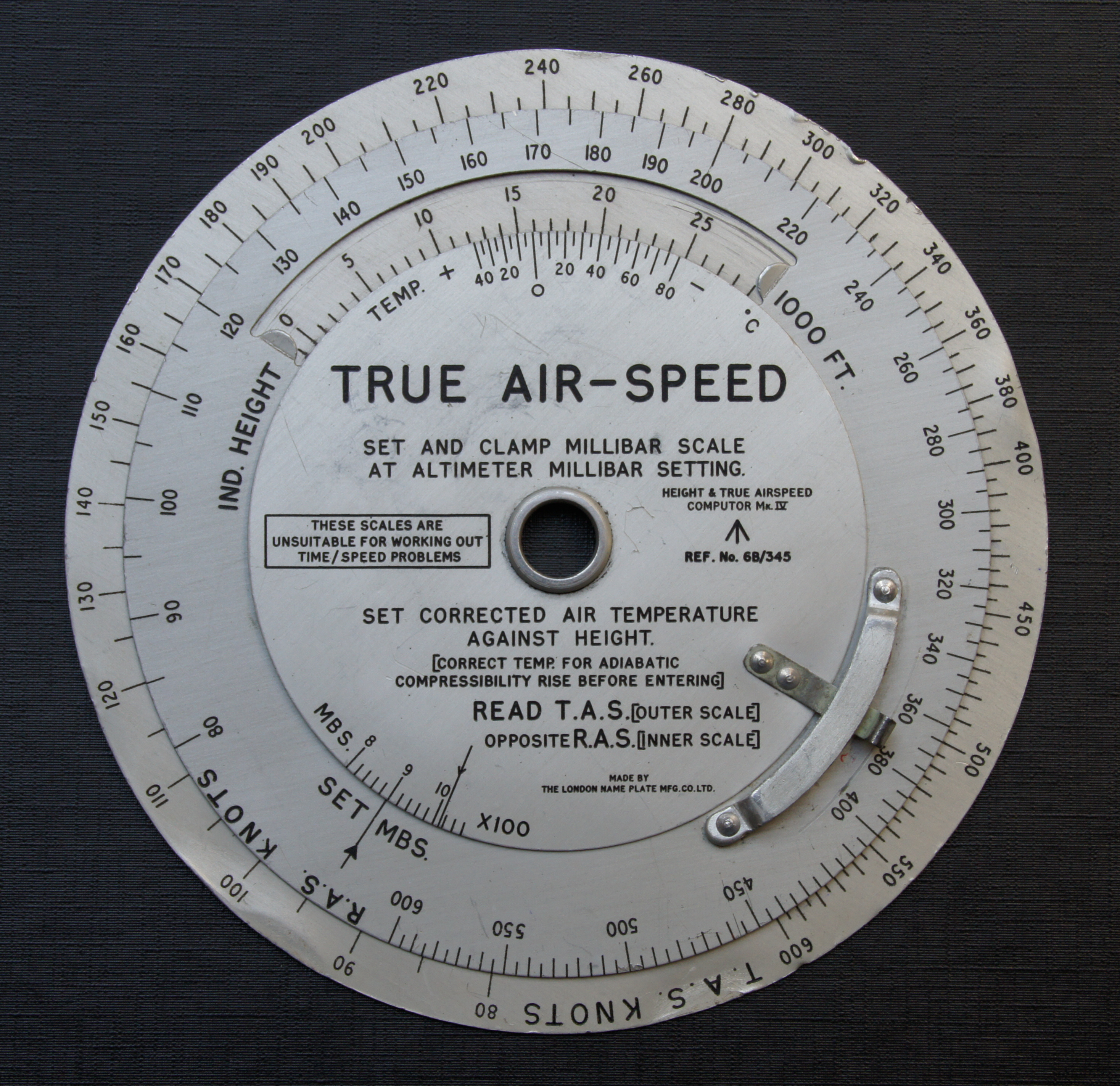 일부 속도 지시계에는 TAS 눈금이 포함되어 있어 외부 기온과 압력 고도를 입력하여 설정할 수 있다. 또는 CAS, 외부 기온(OAT) 및 압력 고도를 입력하여 E6B 비행 계산기나 이와 유사한 계산기를 사용하여 TAS를 계산할 수도 있다.