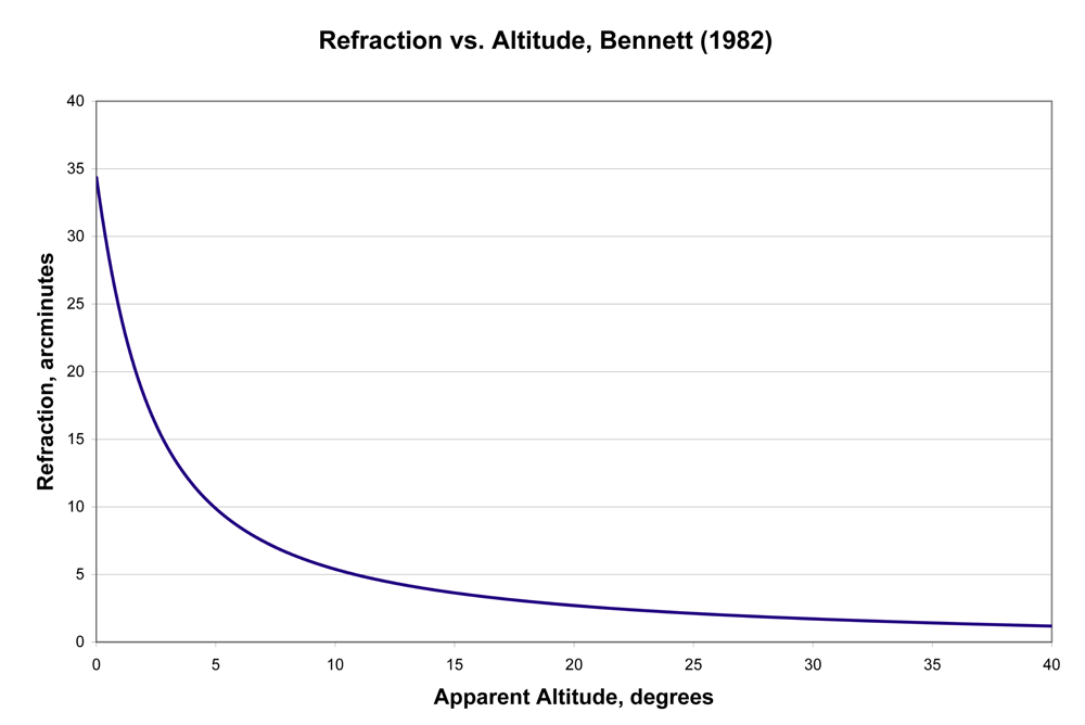 Bennett는 겉보기 고도로부터 굴절을 계산하는 간단한 경험 공식을 개발했는데, 아크분 단위의 굴절 ''R''은 다음과 같다.