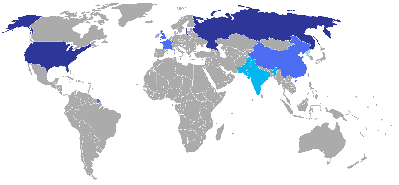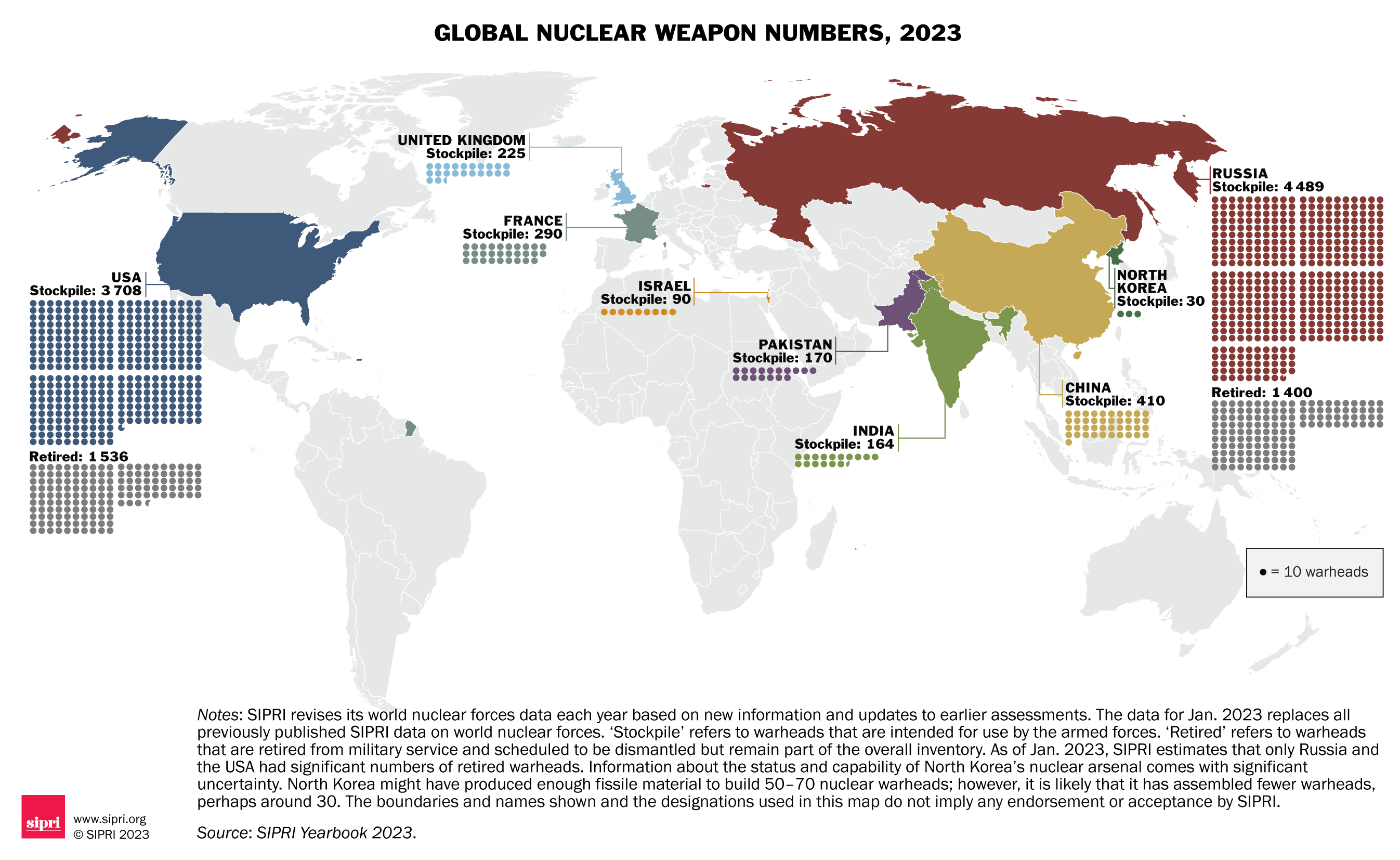 2023년 초 기준으로, 전 세계적으로 9개 국가가 핵무기를 보유하고 있는 것으로 알려져 있다. 이들 국가는 미국, 러시아, 영국, 프랑스, 중국, 인도, 파키스탄, 조선민주주의인민공화국(북한), 그리고 이스라엘이다. 이들이 보유한 핵무기는 총 약 12,512개로 추정되며, 이 중 약 9,576개가 실제 사용 가능한 상태로 간주된다. 이 가운데 약 3,844개의 핵탄두가 작전 부대에 배치되어 있으며, 약 2,000개는 즉시 발사 가능한 높은 경계 태세를 유지하고 있는 것으로 파악된다. 이는 전년도와 비슷한 수준이다.[73]