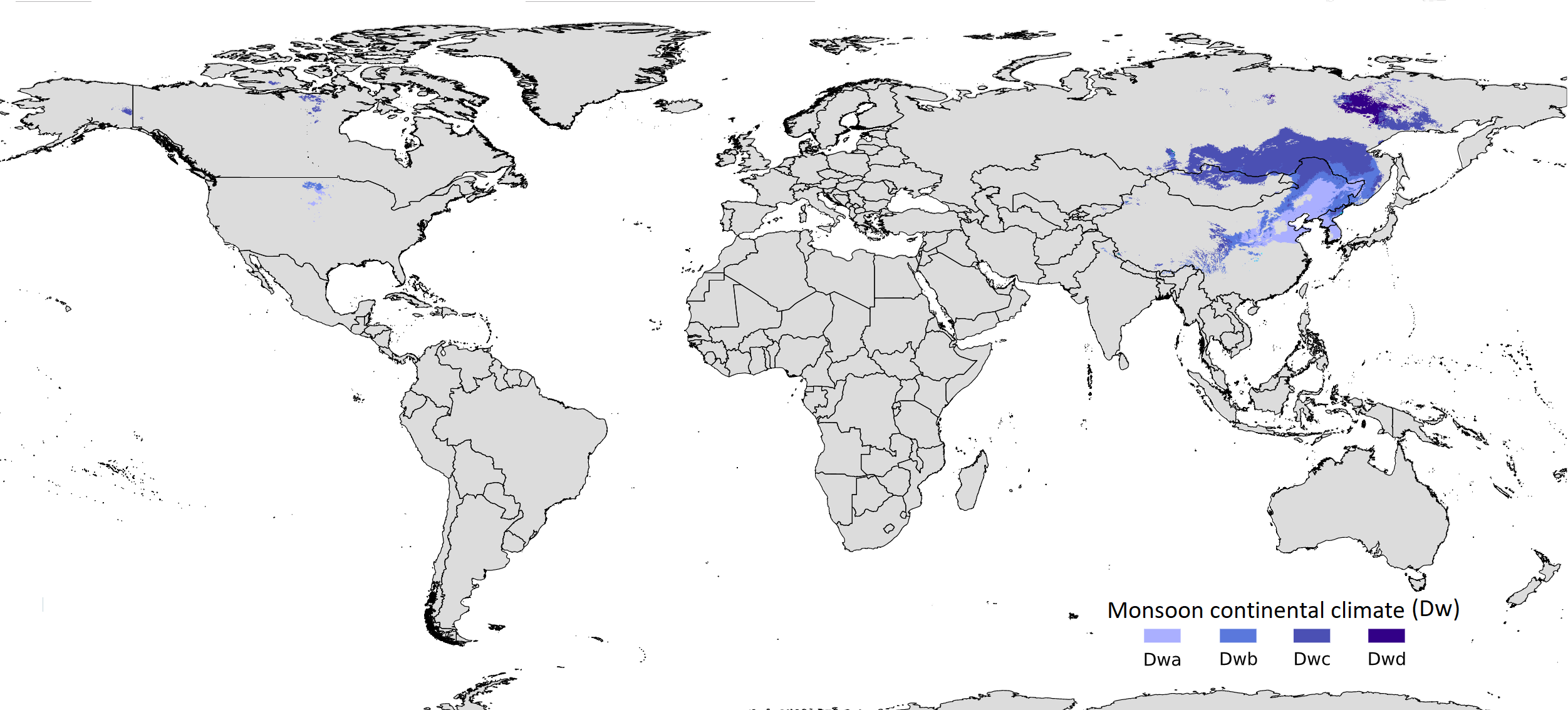 - Dwd (계절풍의 영향을 받는 매우 춥고 건조한 아한대 기후): 가장 추운 달의 평균 기온이 -38℃ 미만이고, 평균 기온이 10℃를 넘는 달이 1~3개월 있다. 여름철 가장 강수량이 많은 달의 강수량이 겨울철 가장 건조한 달의 강수량의 10배 이상이다.