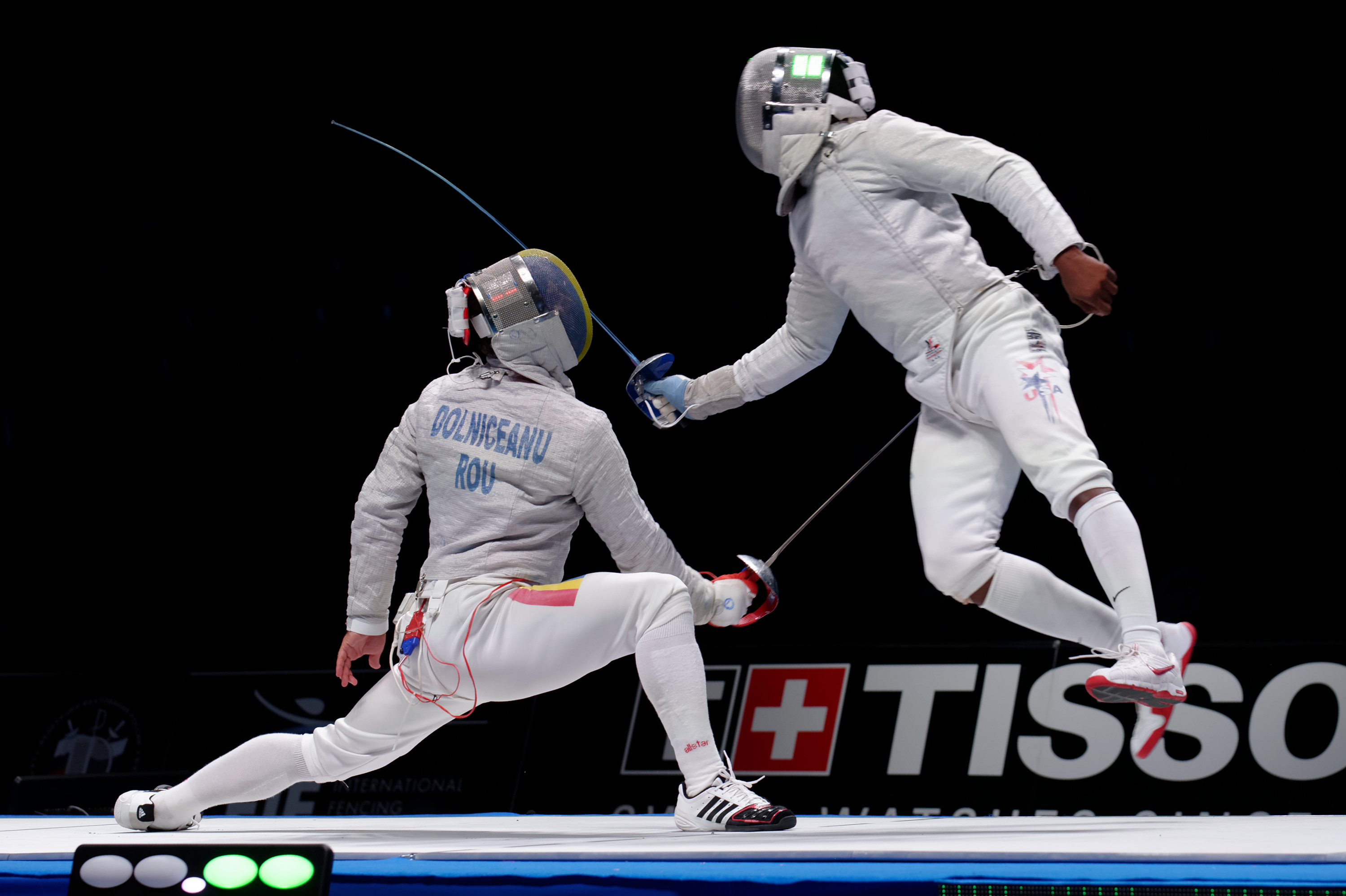 호머 (오른쪽)가 2015년 세계 펜싱 선수권 대회에서 플런지를 통해 득점하고 있다.